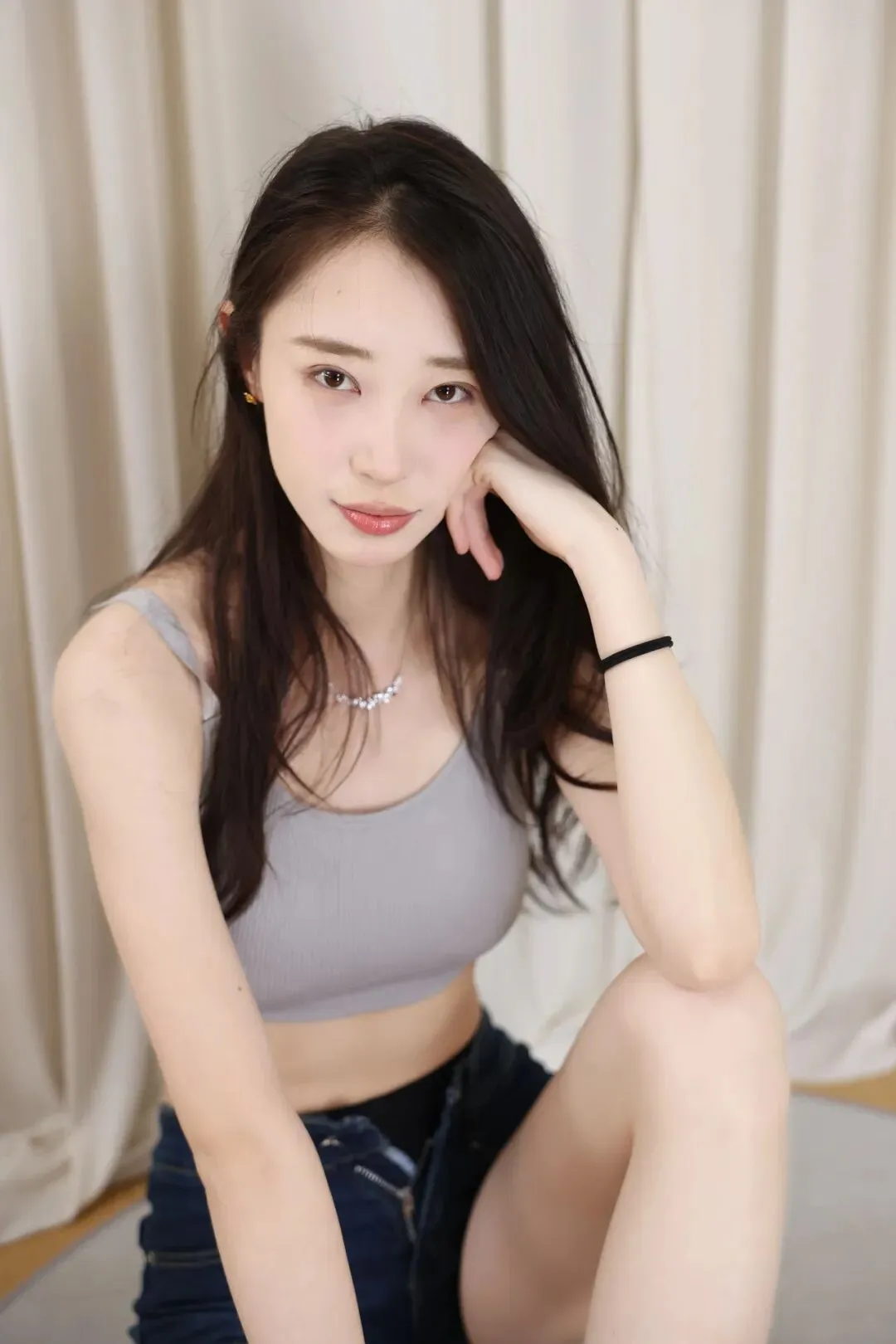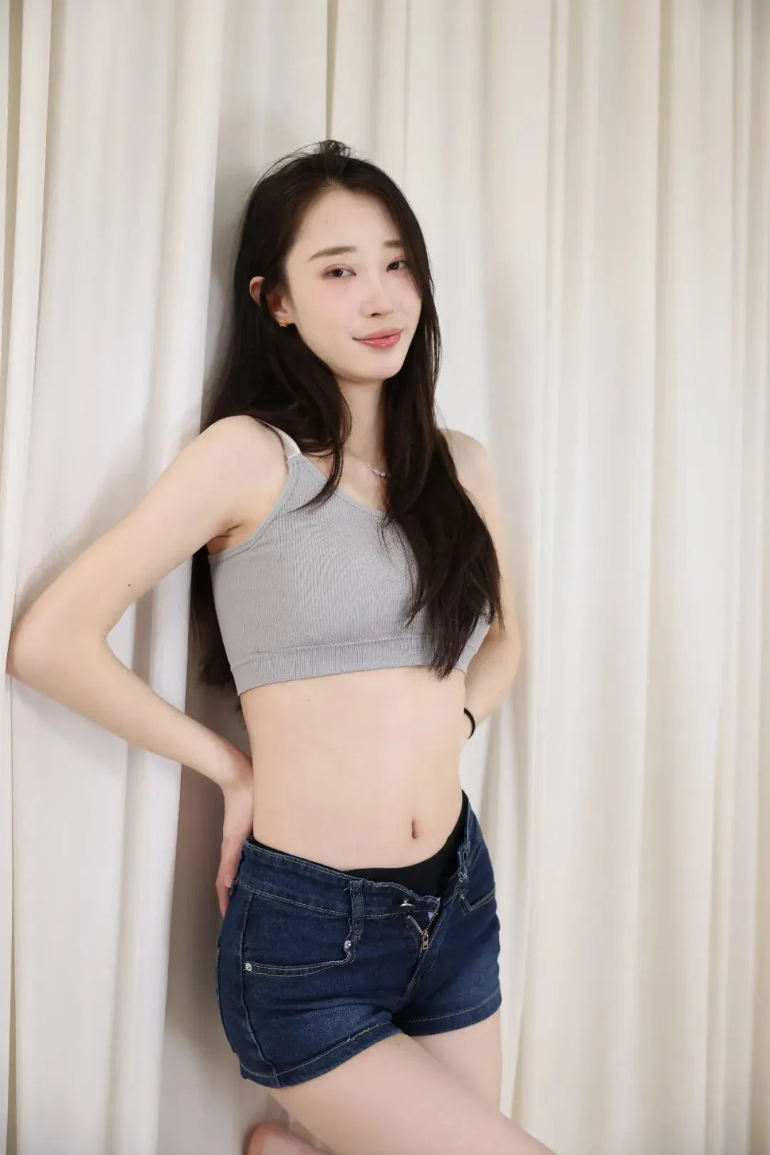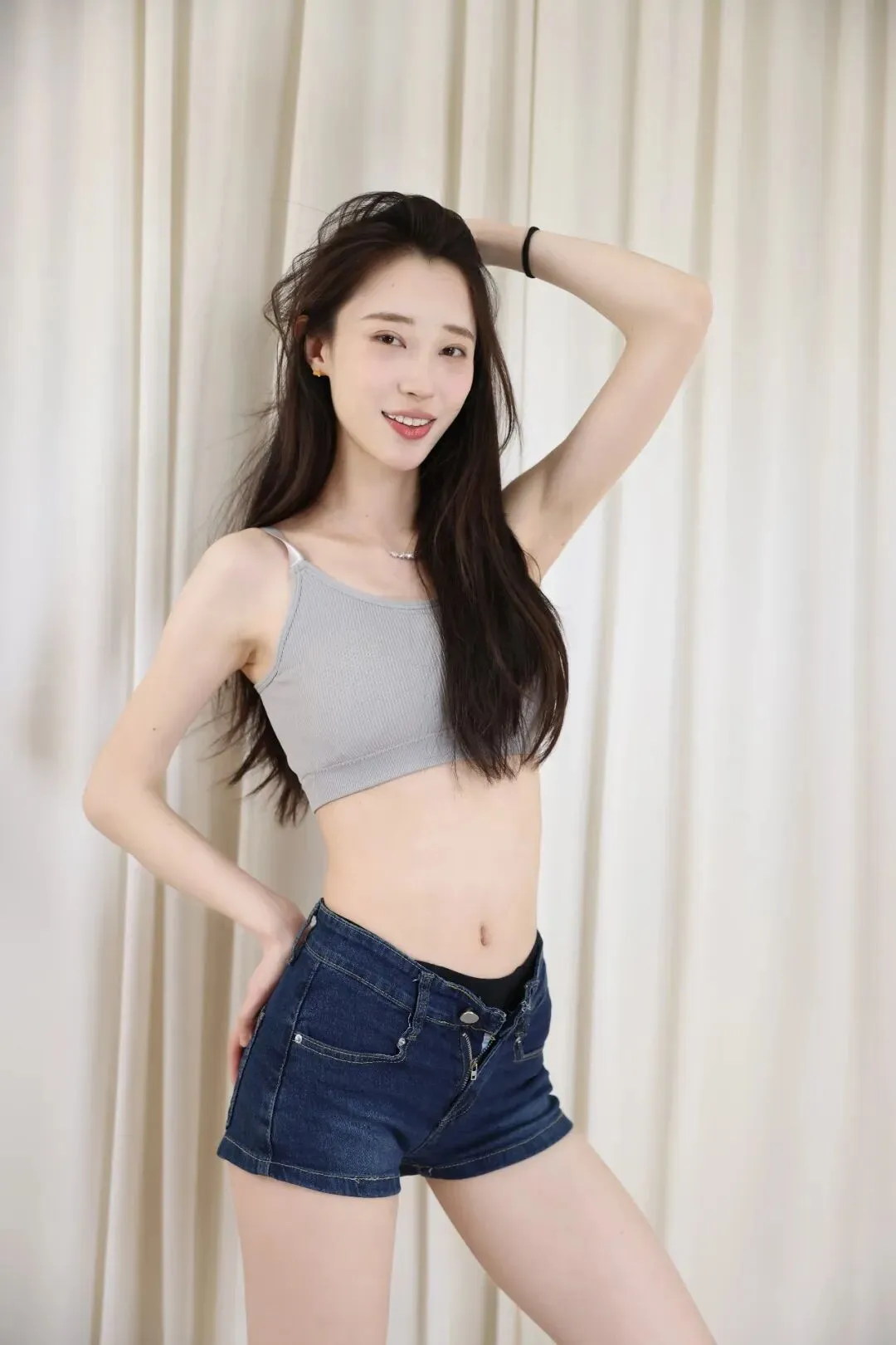 浅灰色运动背心搭配深色牛仔短裤,没有多余的装饰,却被模特小贝穿出了独属于青春的清爽感。简约的白幕布背景弱化了干扰,让人物本身成为画面的主角,利落的线条、松弛的状态,把少女的活力与娇俏,完美定格在镜头里。