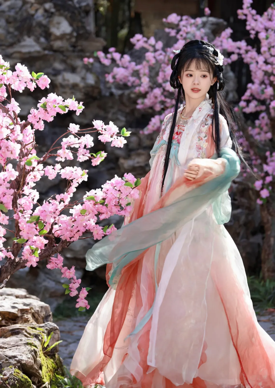 她笔下的国风插画里,总藏着汉服的温柔细节;而她自己穿上齐胸襦裙时,就是从画里走出来的春日海棠。衣袂拂过花枝的瞬间,像把千年的诗词,都揉进了这一场温柔的风里。