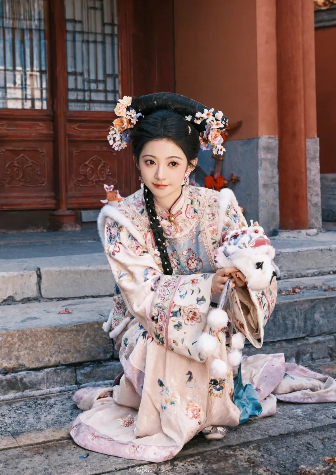 朱红宫墙之下,她捧着小兽的模样,宛如宫廷里最受宠爱的格格。旗头上的繁花、刺绣中的纹样把清代皇家温柔和高贵都藏在了她的眉眼间。”