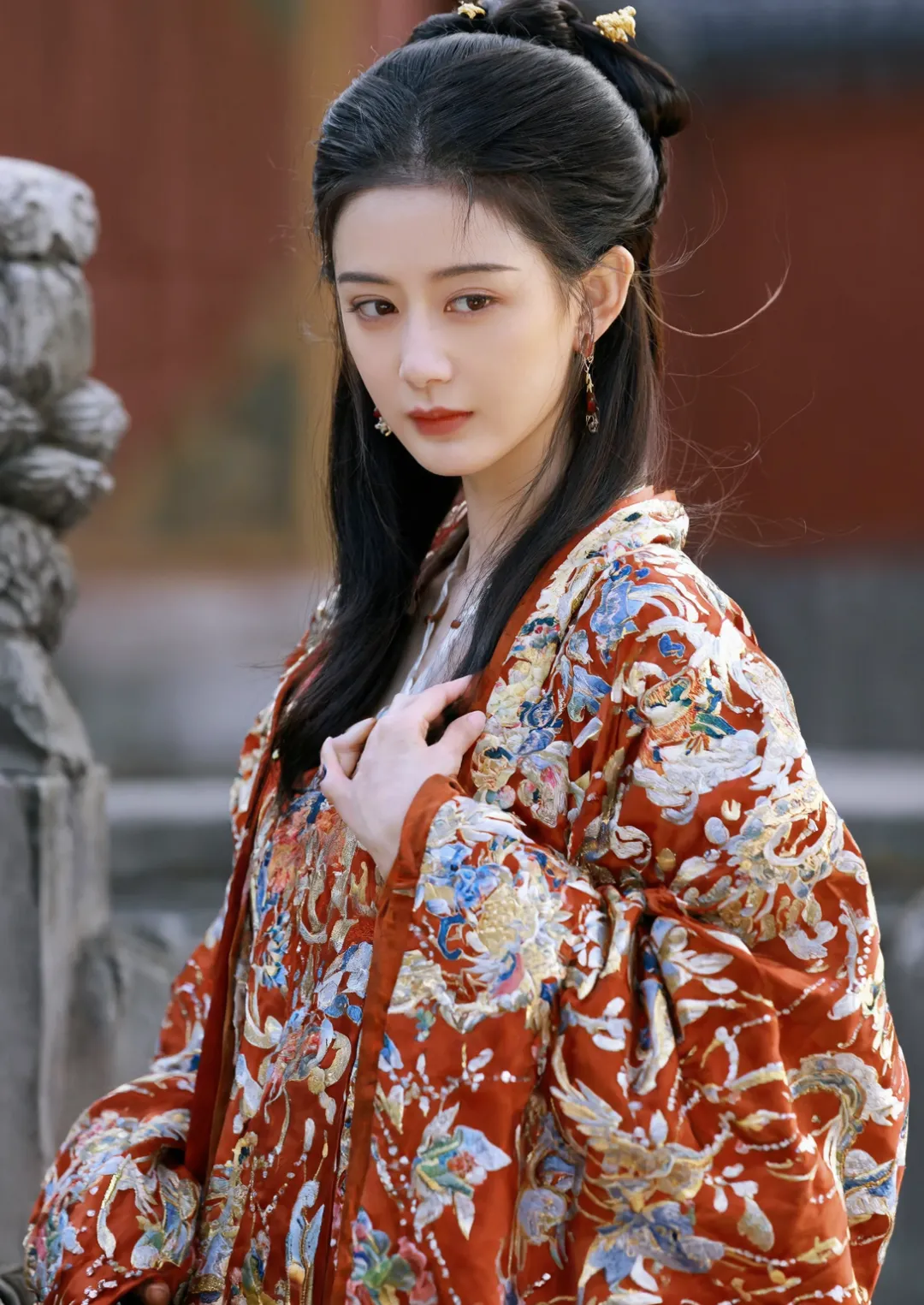 朱砂色的衣袍上,金线和彩线织就了满幅繁华。她站在红墙之下,在眉眼之间洋溢着盛唐时期的自信从容,并且似乎一抬手就可以触摸到千年前盛世的辉煌。”