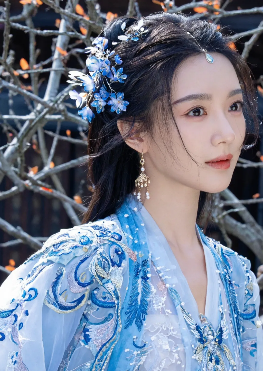 蓝色的纱衣犹如一汪清泉,使她看上去像枝头绽放的新梨花。发间蓝花朵步摇轻轻晃动着眉毛清澈干净似未染尘世的一位仙子缓缓从云雾中走来。”