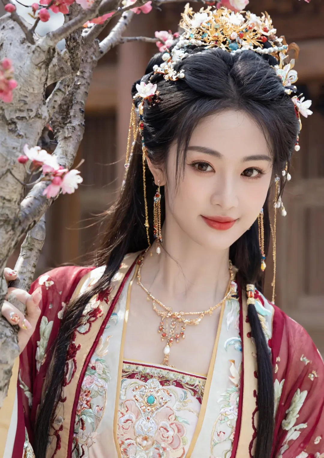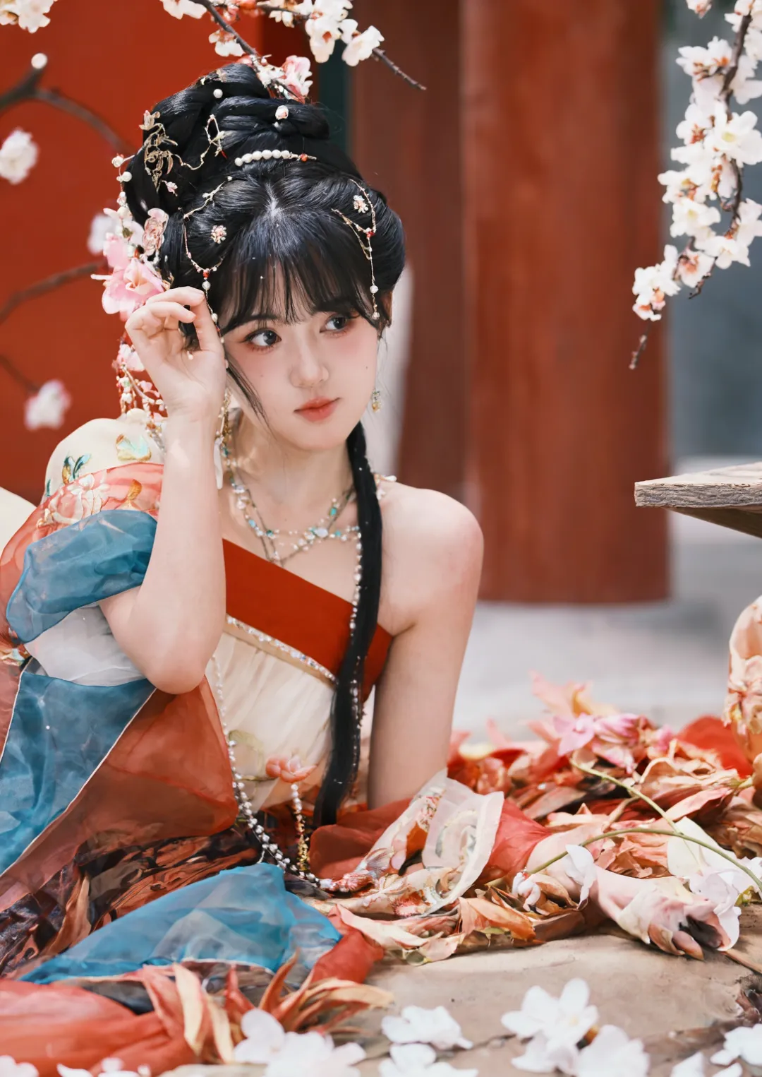 她靠在花枝上,眼尾泛着淡淡的胭脂红,像极了盛唐画中走出来的仕女。半露的肩颈、飘逸的裙摆之中藏着少女特有的娇俏和热烈之情,在一眼间就让人感到心动。”
