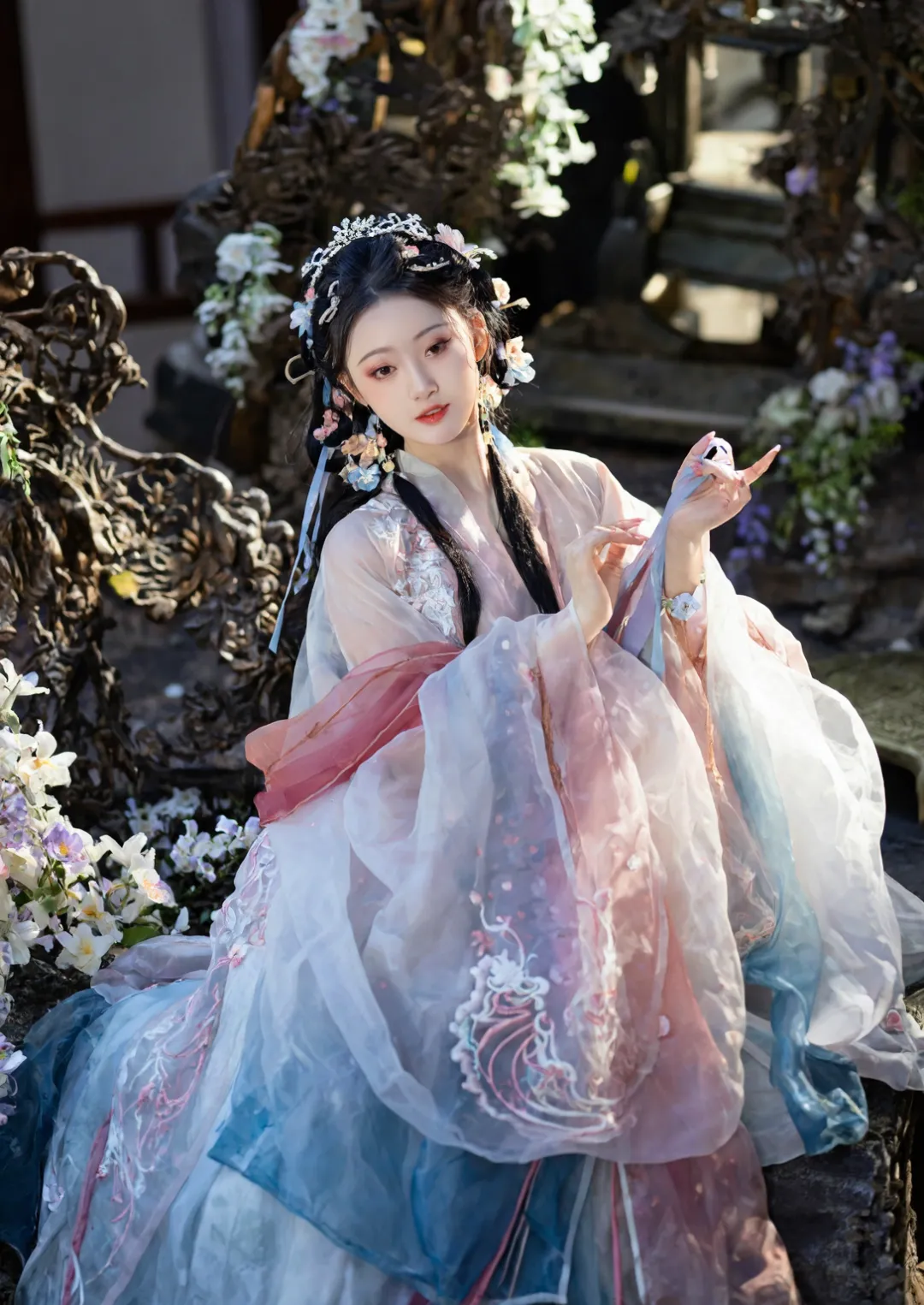 她靠着花树,粉色和蓝色渐变的裙摆像被揉碎了的日落。轻纱漫舞之时眉眼间透出一股温柔灵动的感觉,并且仙气十足的好像是从《天衣无缝》里走出来的小仙女一般。”