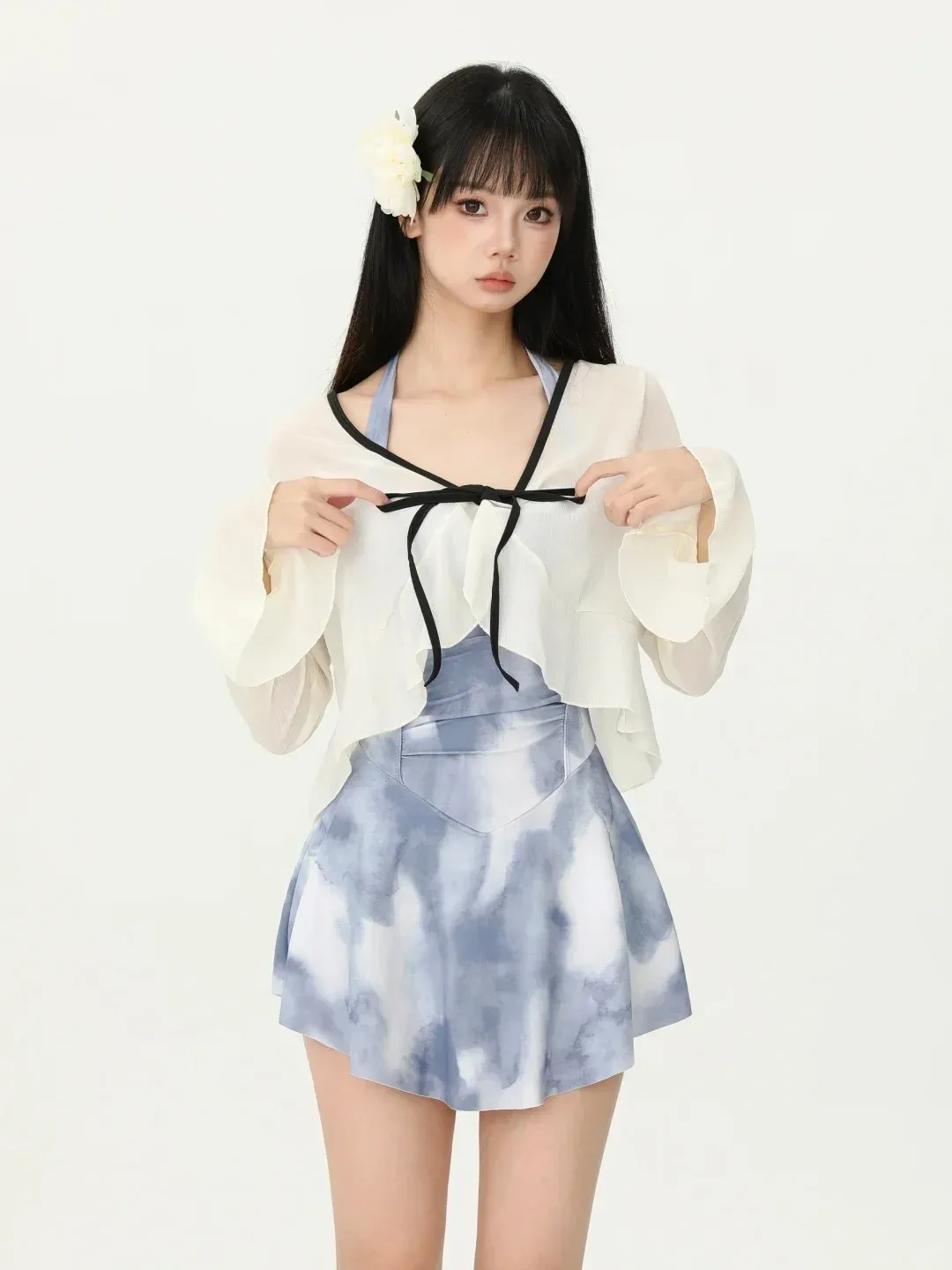 这套蓝白晕染如果只有印花,其实容易拍成睡衣感。救它的是那圈黑色滚边和胸前黑丝带,把轮廓线框住了,像给水墨画加了画框,立刻立住。
