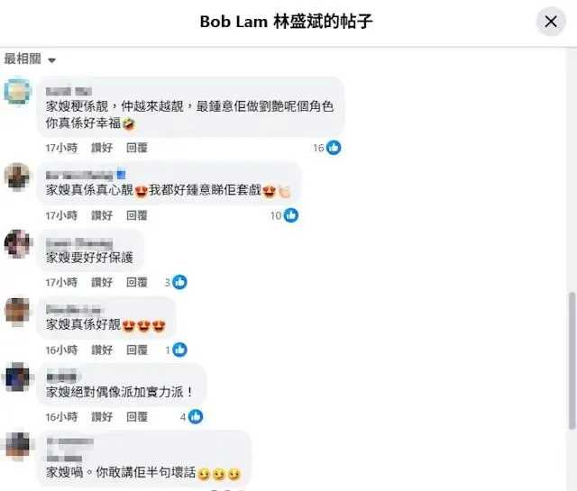 面對阿Bob的公開讚賞,留言區呈現一面倒的支持態勢,有網民笑言阿Bob今次能夠與女神近距離共事「真係好幸福」,更有不少聲音強調「家嫂」是真心漂亮,且演技日益精進,特別是早前劉艶一角更是入木三分。更有鬼馬的網民提醒阿Bob,面對身分地位特殊的「家嫂」,自然是「唔敢講佢半句壞話」,字裡行間充滿對王敏奕的喜愛。
