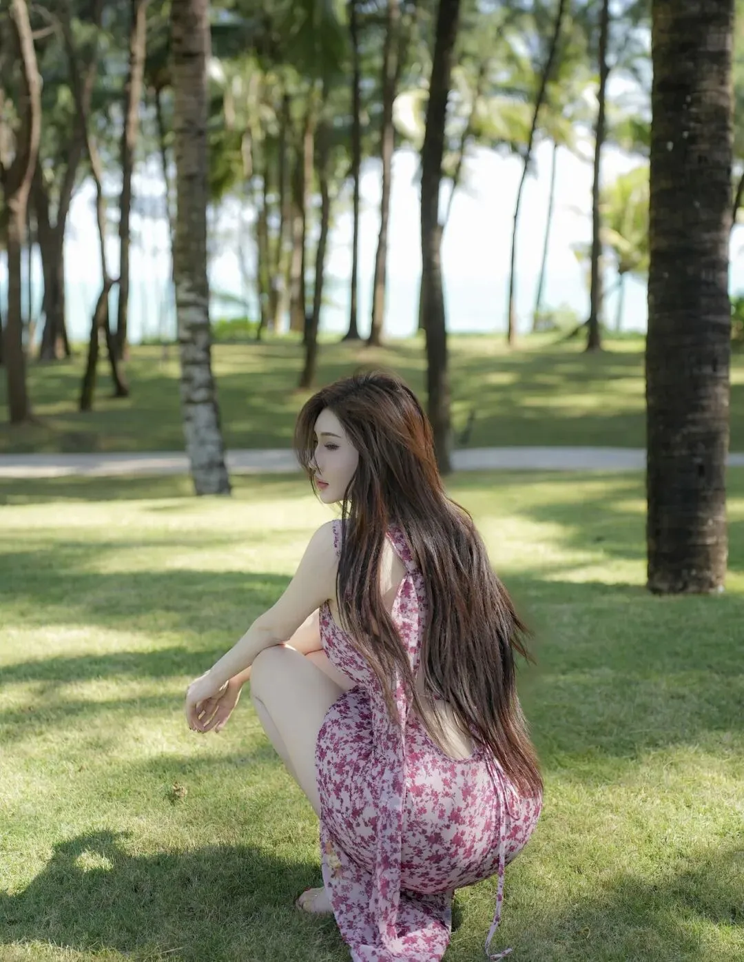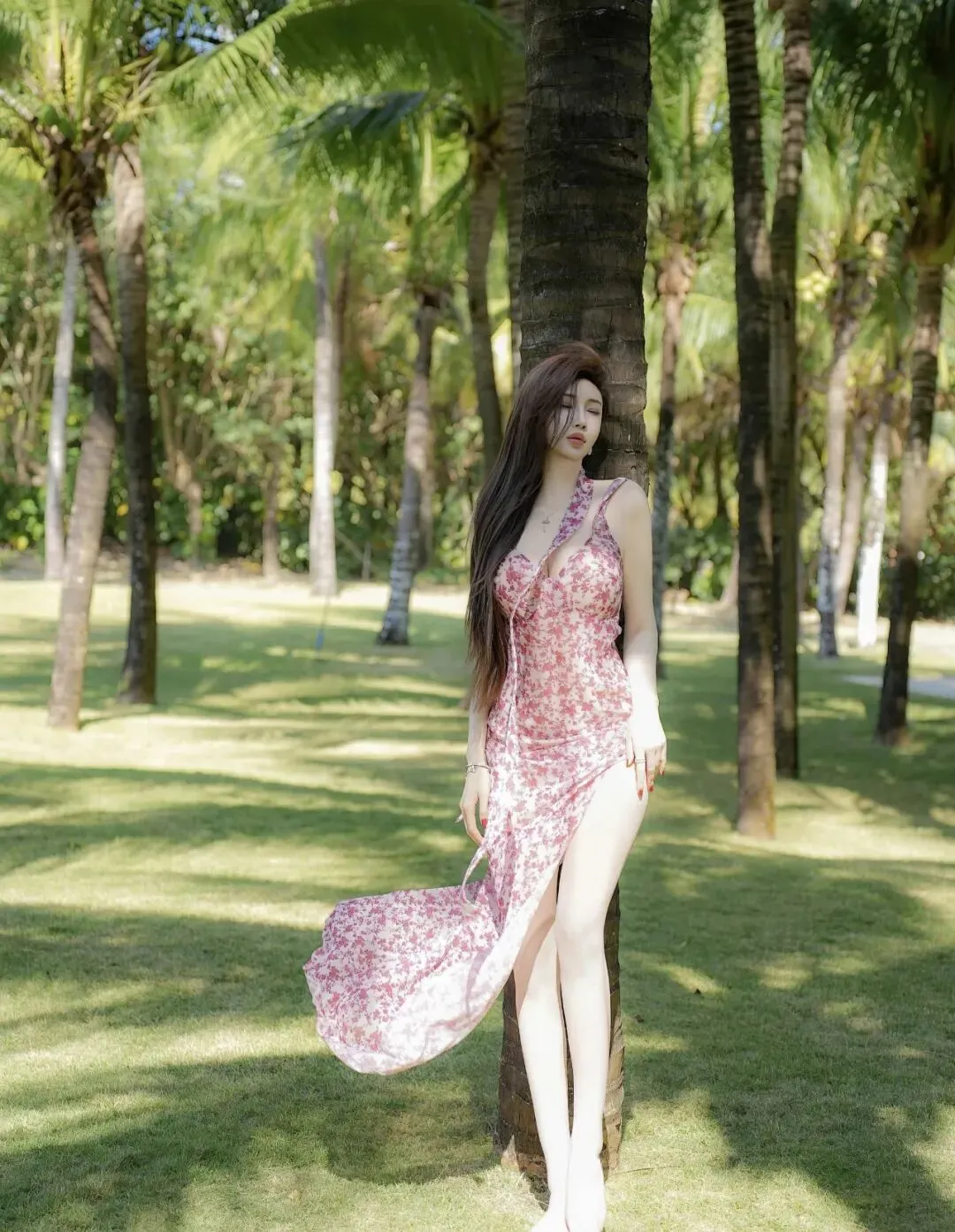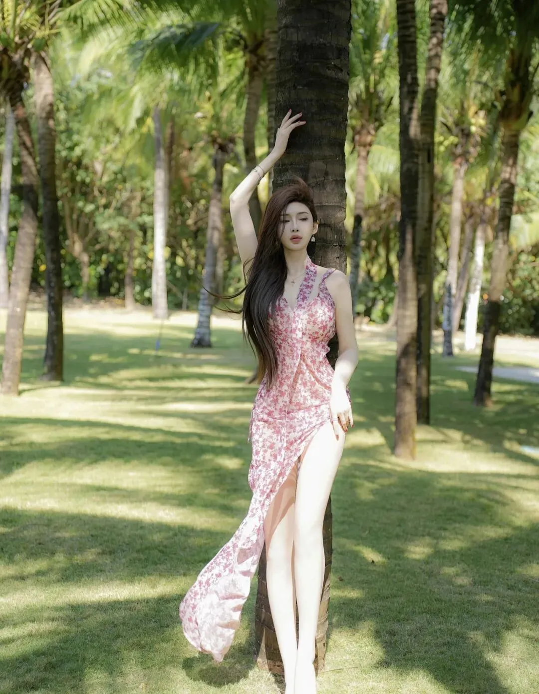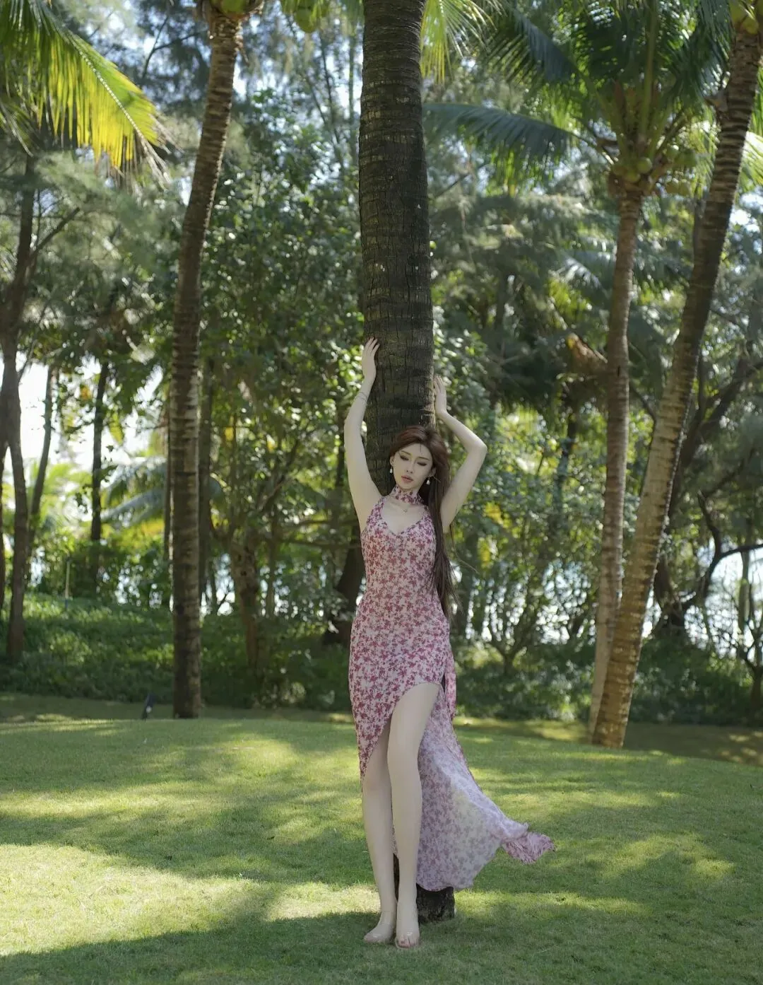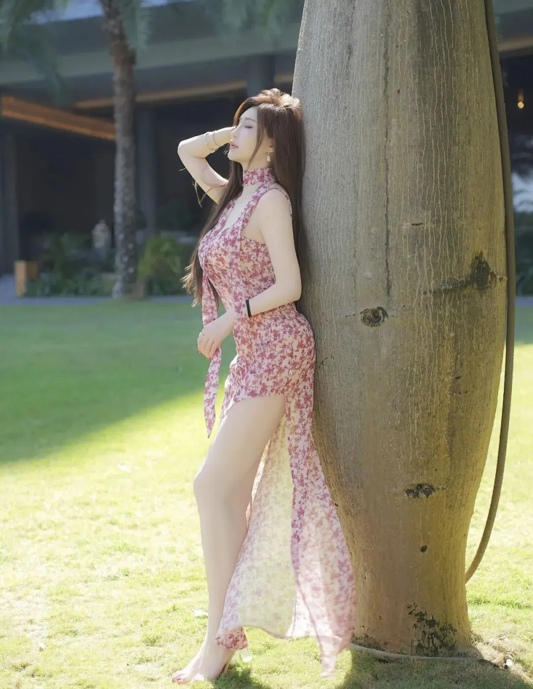本期作品中,她清新碎花+挂脖露背+高开叉,出片率100%,美到自带高光!