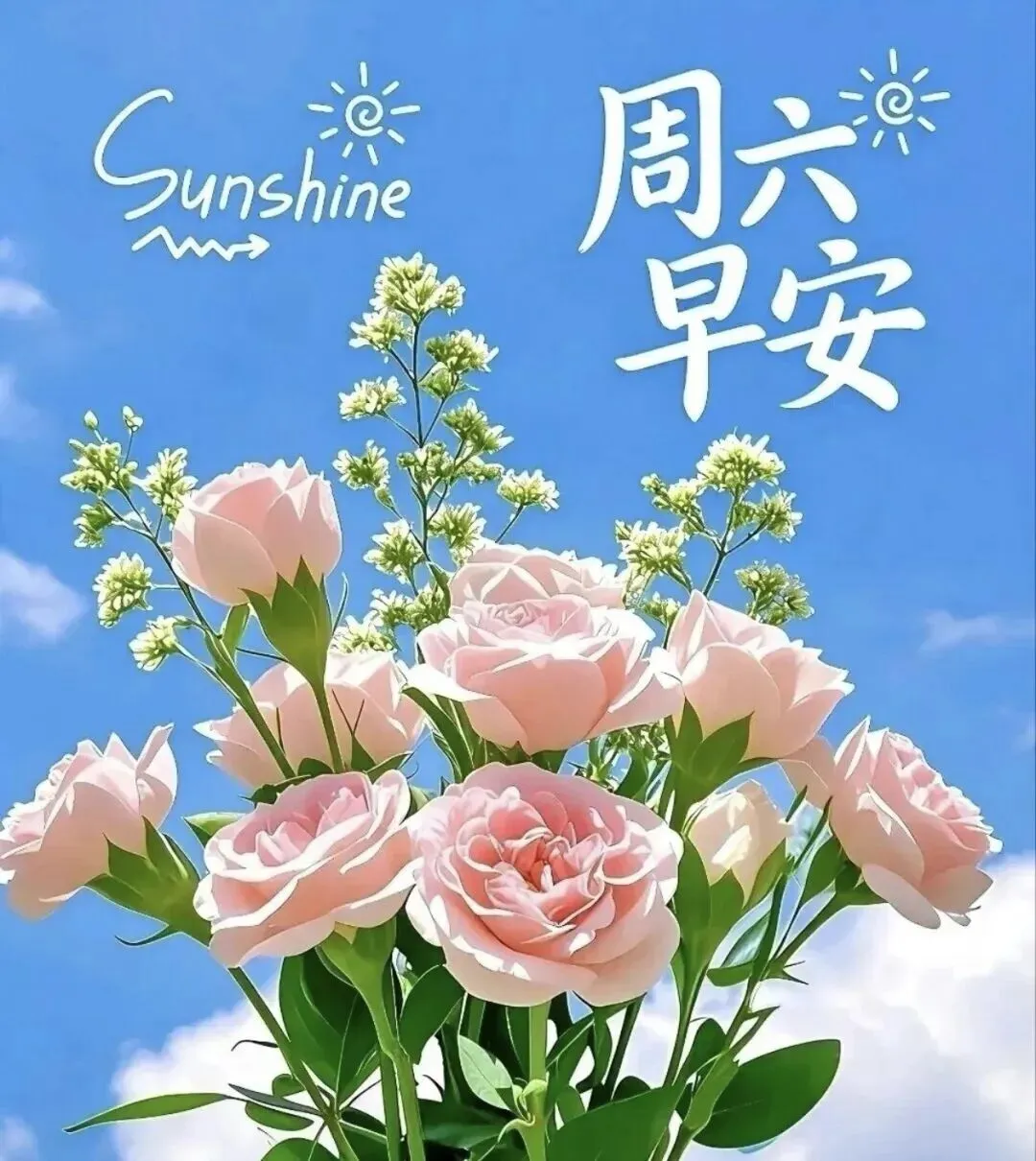 5. 周六早安☀️!愿清晨的第一缕阳光,照亮你前行的路,温暖你柔软的心。愿生活不拥挤,笑容不刻意🌷,烦恼随风吹散,好运悄悄降临,每一天都活得轻松、过得舒心😊。