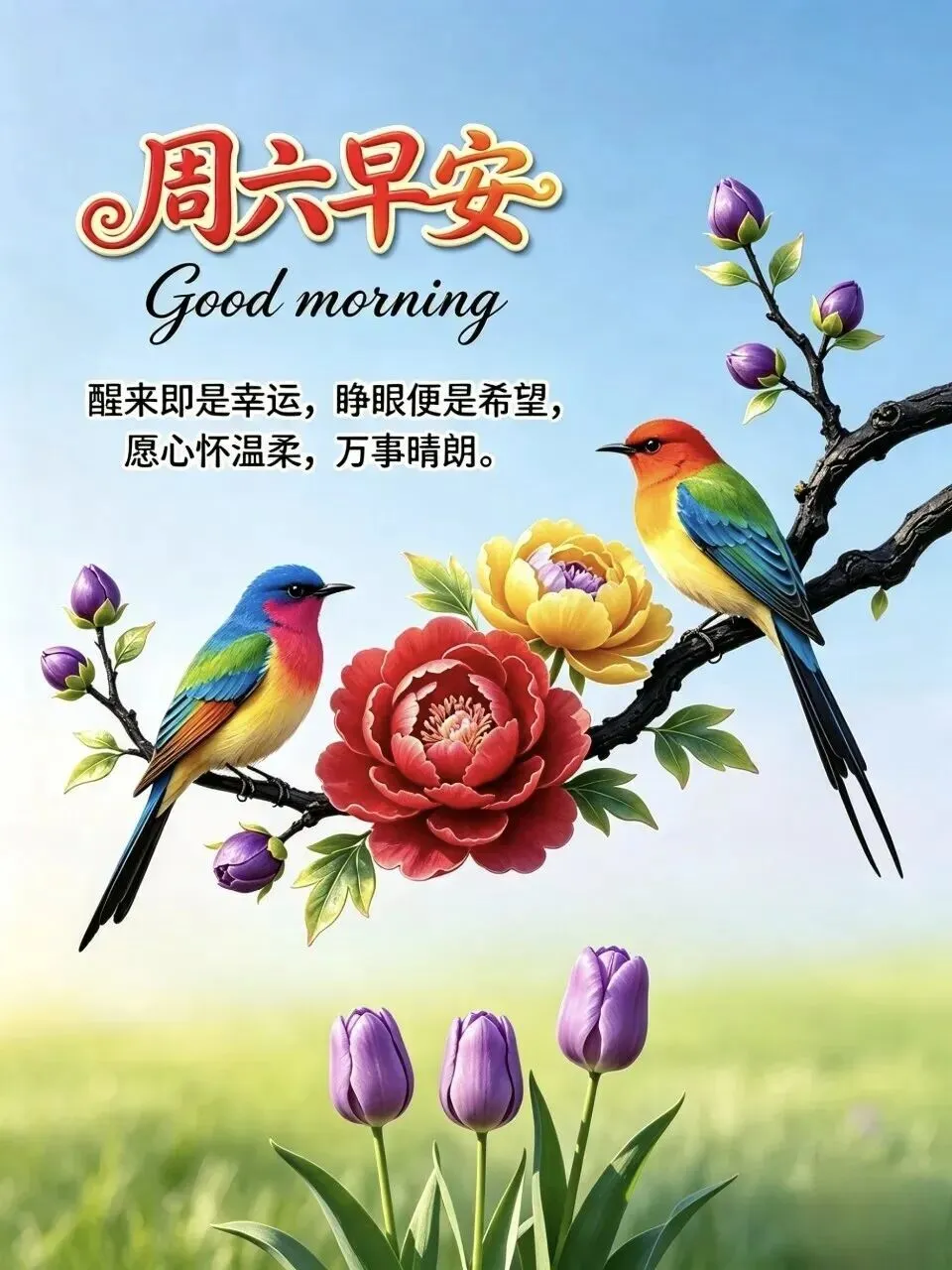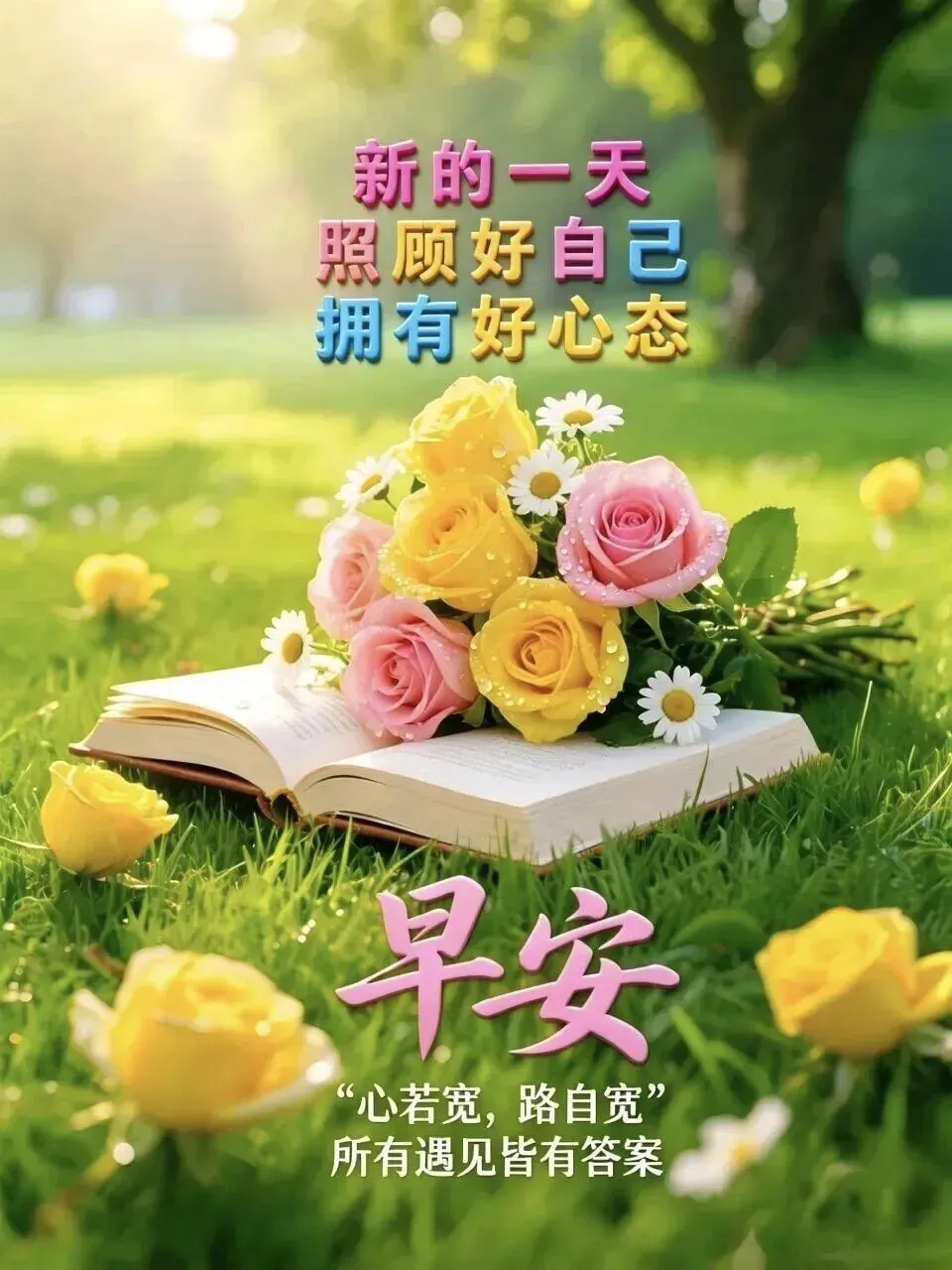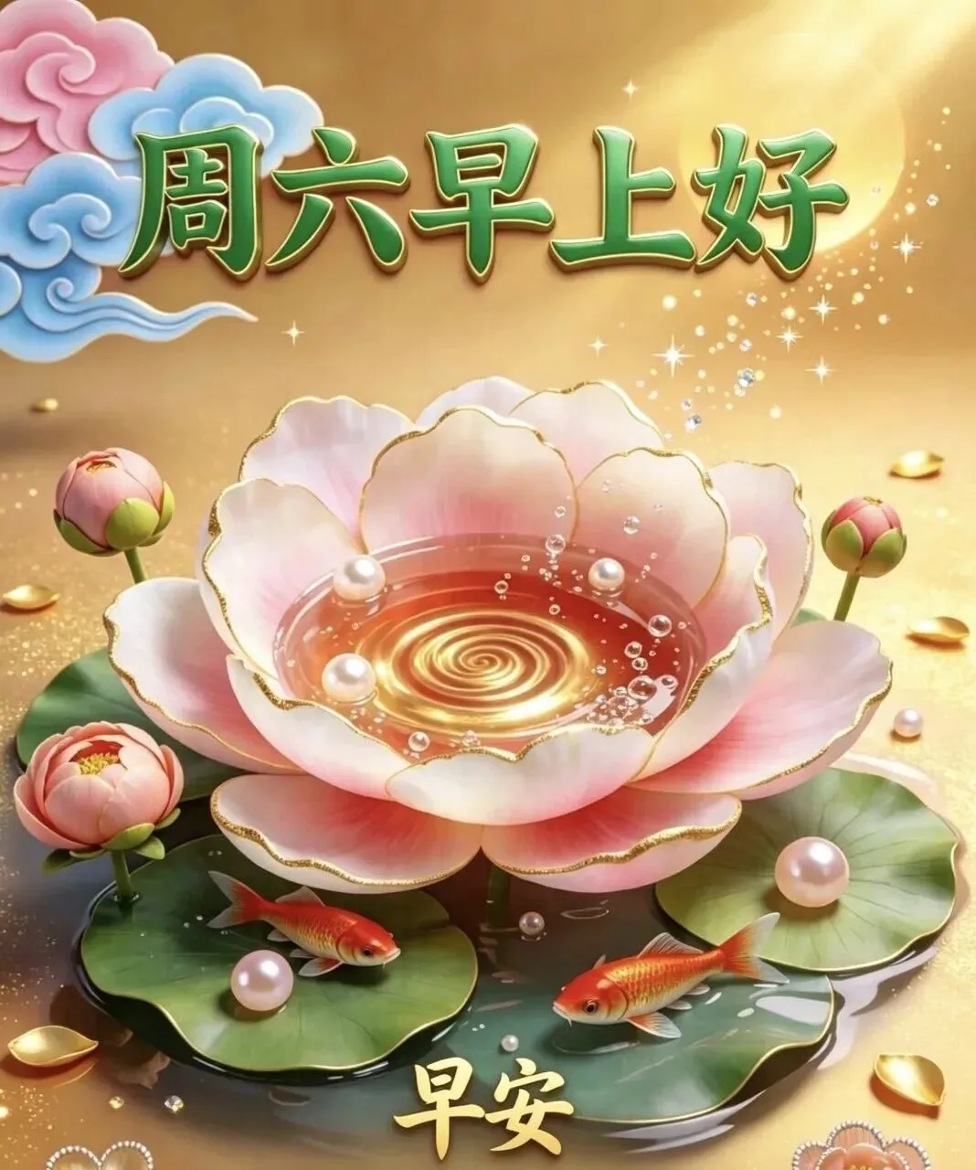 13. 早安呀~周六快乐🥰!愿清晨的微风带走忧愁,温暖的阳光带来好运。生活不必太匆忙,心安便是归处🌿。愿你三餐有味,四季有暖,心中有喜,身边有爱,岁岁皆平安💐。