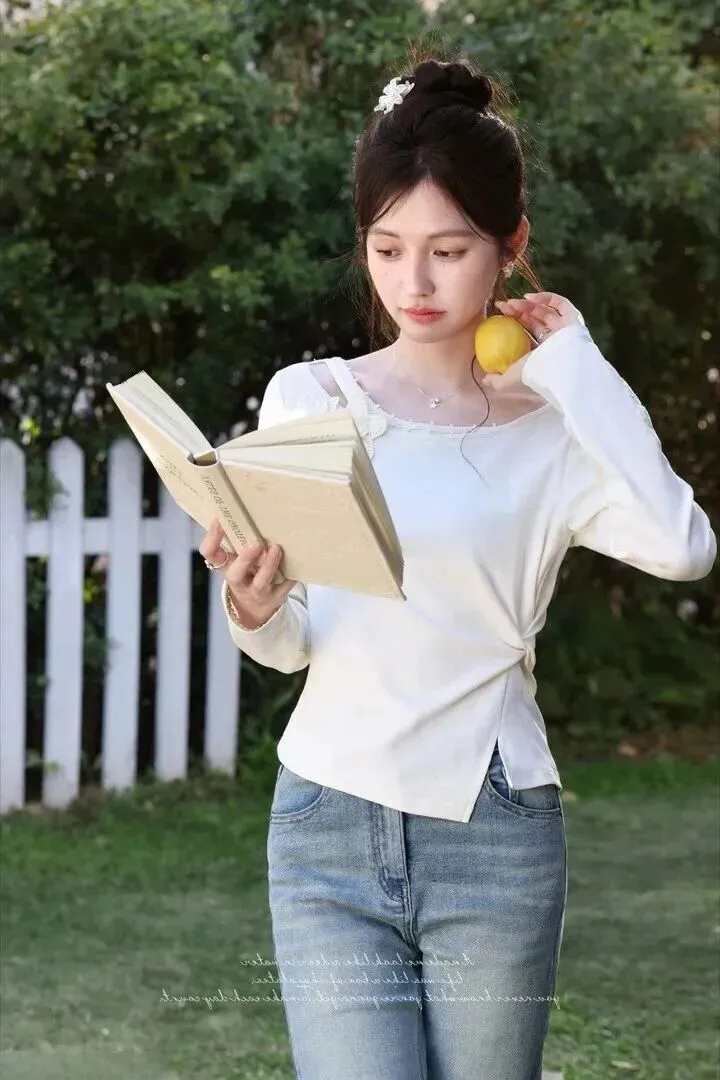 这件米白色的针织上衣真的好看,露肩设计带有小性感的味道,坑条纹理让质感更好。穿条浅蓝水洗牛仔裤,人立马感觉清爽有型。小女孩坐在草地上读着地上的书,手上拿着一个柠檬。春天午后随便穿一穿都是文艺片女主角的气质。