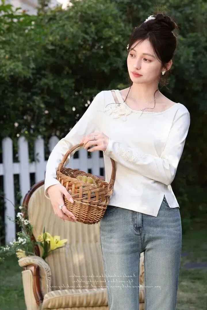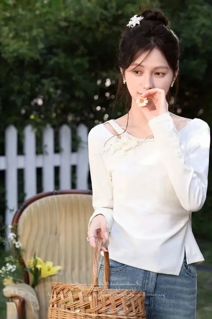 最后一套斜肩上衣配修身牛仔裤,清清爽爽的像是从田园画里走出来的一样。上衣立体的花朵十分细致,小姑娘手拿编织篮站在外面,整个人都散发着一种治愈感。春天穿这身去公园散步,心情都会变好。