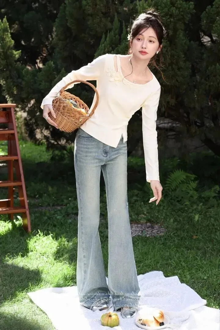 米杏色长袖针织上衣搭配微喇牛仔裤,复古味一下子就出来了。上衣镂空的花朵隐在其中,喇叭裤毛边裤脚配低跟鞋。小姐姐坐在绿树丛中,一手伸入袋子里很随意很前卫。这种穿搭不会挑选谁来穿,日常出门舒适、有颜值。