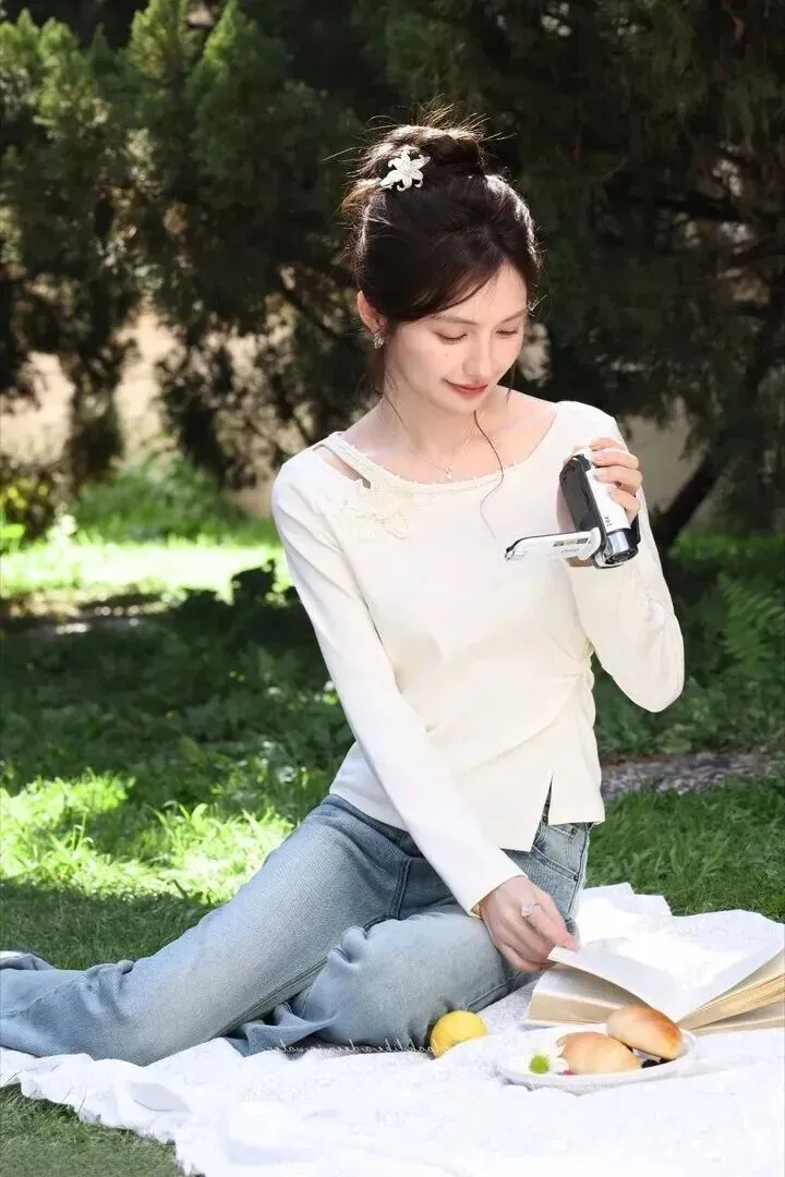露肩针织衫加阔腿牛仔裤,舒服得仿佛没有穿一样。蕾丝花边、刺绣的点缀使少女感更加强烈,在草地上放DV照片的就是小姐姐。这套太适合周末去野餐或短途旅行了,拍照好看,活动起来也很方便。