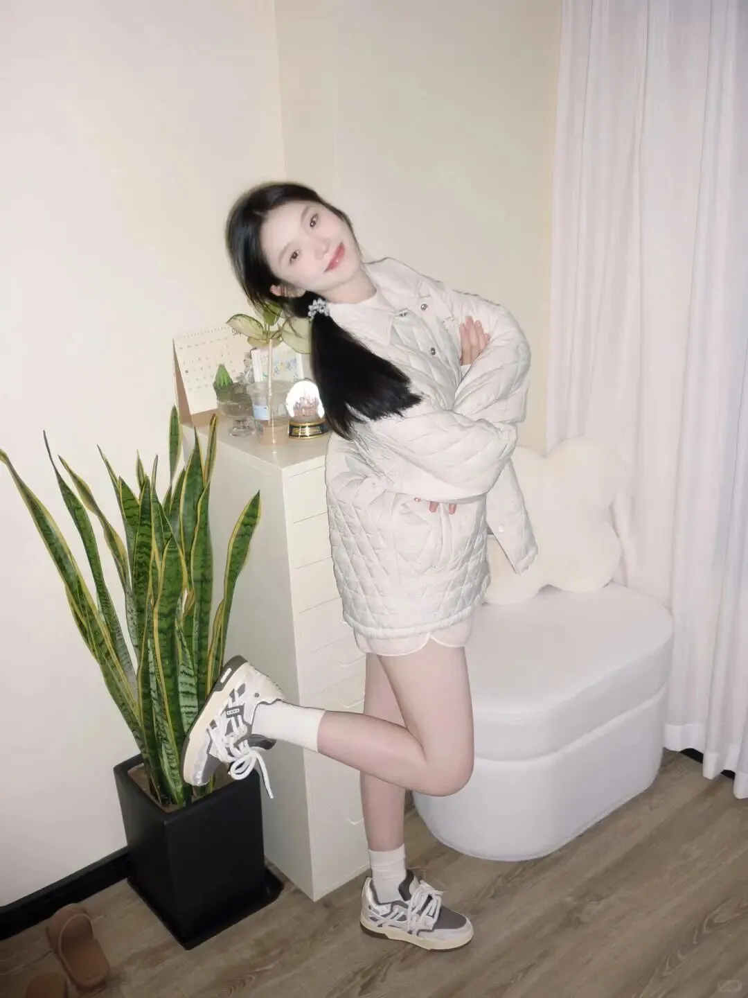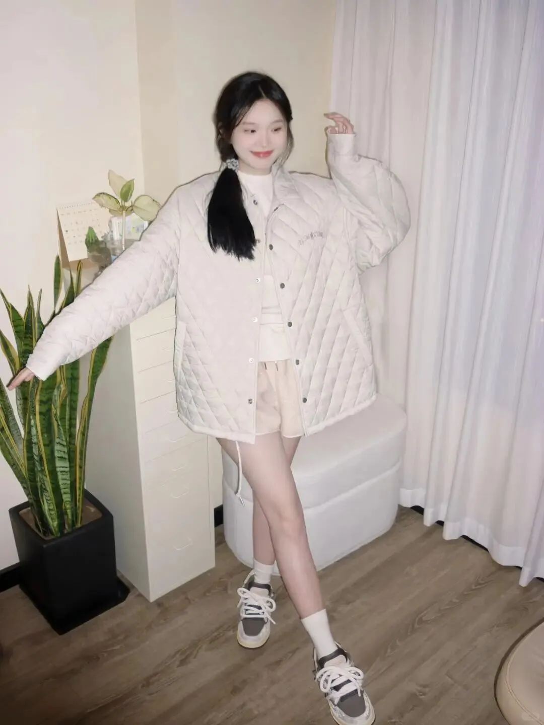 关于穿搭,这次我选的是白色菱格外套搭配浅色短裤,整体色调统一,非常适合春天。白色在室内拍照非常吃亏,因为容易过曝,但其实只要控制好曝光补偿,白色就是最显高级的颜色,自带反光板效果。鞋子选择了运动鞋,增加休闲感,不会显得太刻意,适合日常居家风格。袜子一定要包住脚踝,这样视觉上腿会更细,也能增加层次感。