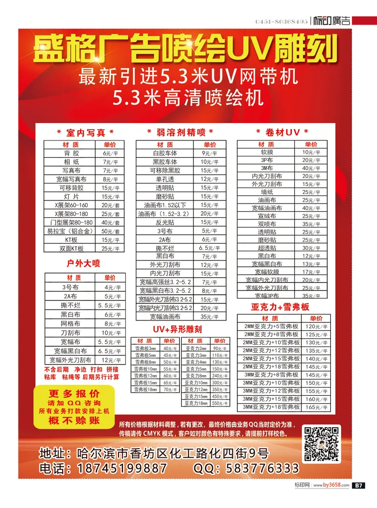 当前位置:首页>美女资讯>哈尔滨盛格广告喷绘UV雕刻 室内写真 弱溶剂精喷 卷材UV 户外大喷 UV+异型雕刻 亚克力+雪弗板