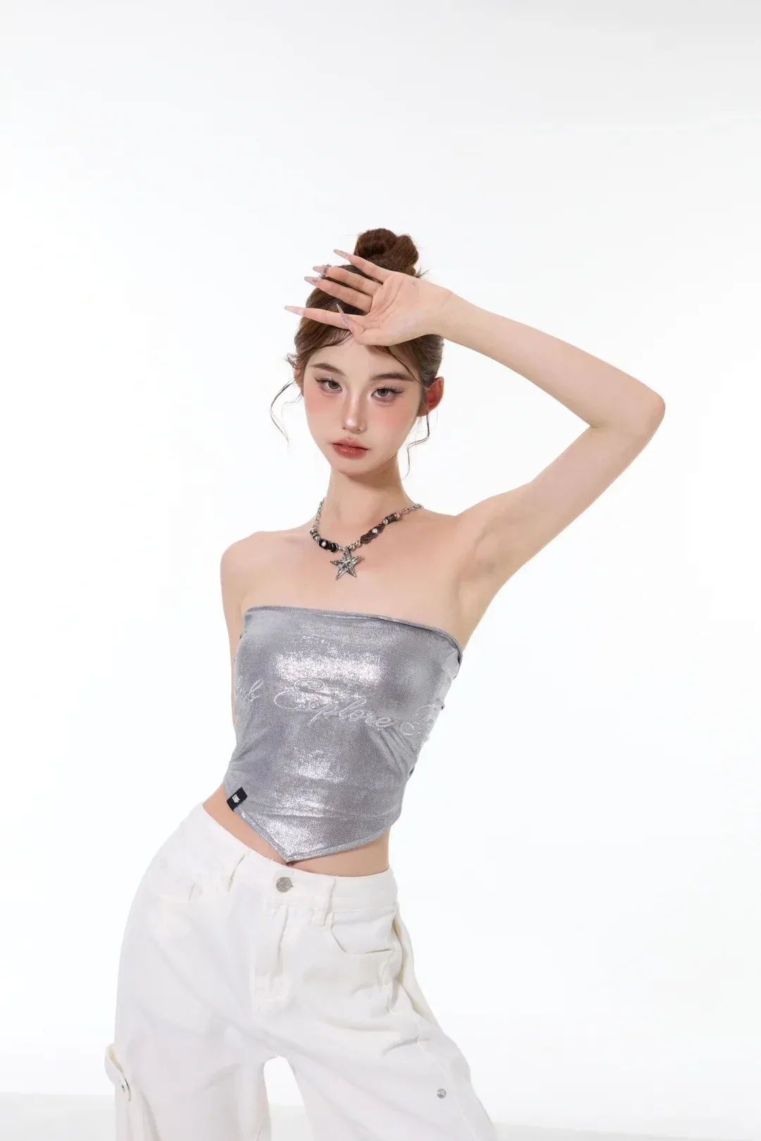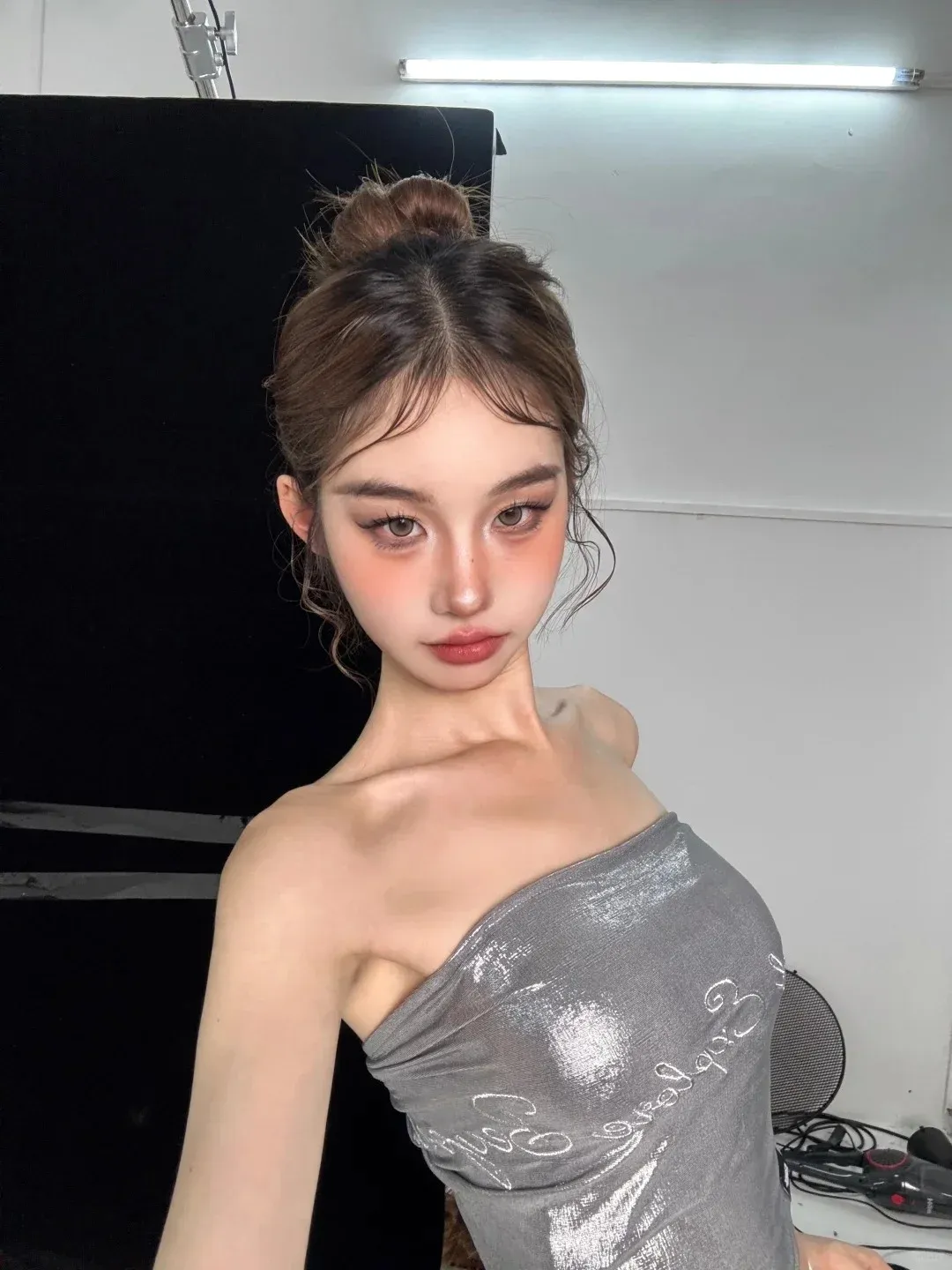 第二张图片表现得更为明显,银灰色抹胸在近距离拍摄当中并未显现出廉价感。主要原因囊括了面料反光以及妆面方向的契合,鼻头高光、腮红以及衣服光泽都朝着一个方向进行呈现,所以不会产生冲突。