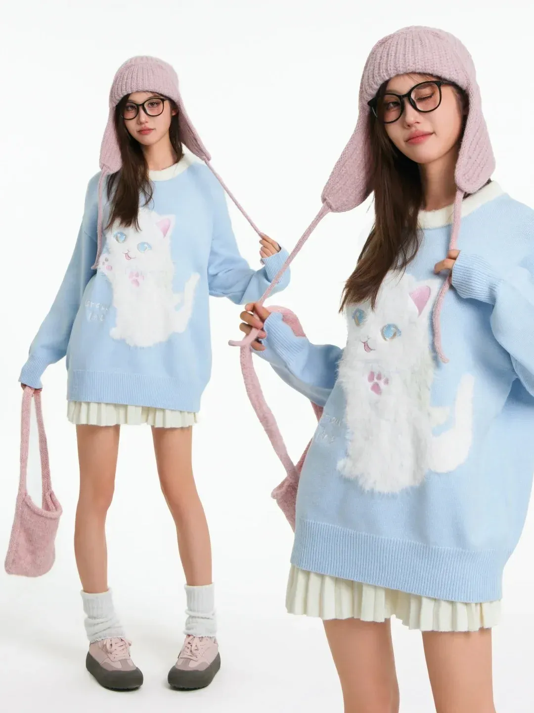 第三张图片表现得较为理想,因为它并非单纯依靠猫的形象。使得整套搭配得以成立的因素是由于上松下轻 的结构:毛线帽、眼镜以及宽松蓝毛衣使得视觉重量都集中在身体的上半部分,下面借助短裙、堆堆袜以及浅粉鞋来进行承托,这样人才不会被毛衣所吞没。