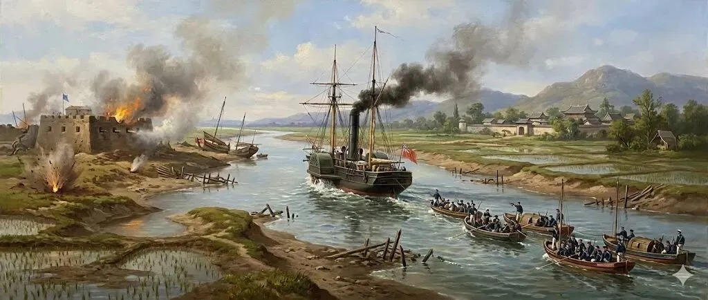 随着炮台陷落,木桩通道已无险可守,仅剩那些战船孤悬于此。然而,目睹据点顷刻易手,又见我方小艇穿过木桩步步紧逼,清军水手顿时惊恐万状。九艘战船中,竟有七艘被船员直接冲上滩涂;他们随即跳水逃生,将这些战船拱手让予我们处置。