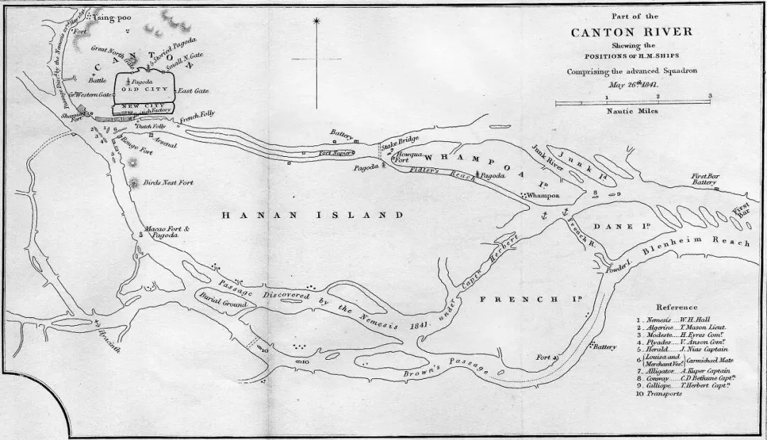我所指的这次行动,后来作为“复仇女神号”在三艘小艇(两艘属于萨马朗号,一艘属于阿塔兰忒号)伴随下强渡百老汇水道(Broadway)、内河水道(Inner Passage)或澳门水道(Macao Passage,它拥有所有这些名称)而广为人知。这条通道从澳门直通广州,但此前仅供本地船只通行;事实上,其他船只也不被允许通过。这是“复仇女神号”众多展示浅水铁壳蒸汽船在未探索河流沿线进行敌对行动之巨大优势的机会之一。
