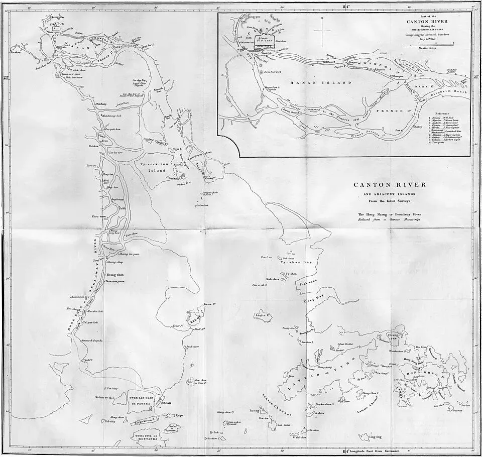 盒子君附图:珠江水道地图,图中有复仇女神号探索的河道标注