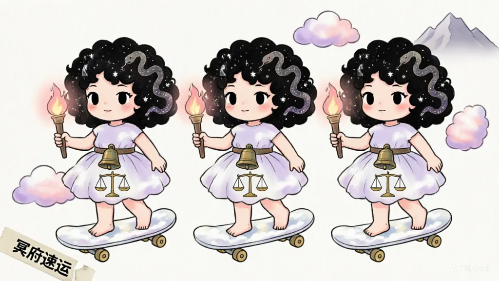 "appearance": "Q版三连萌少女:蓬松黑卷发缀星尘小蛇,赤足踩云朵滑板,手持迷你火炬与青铜铃铛,裙摆印着微缩审判天平纹样",