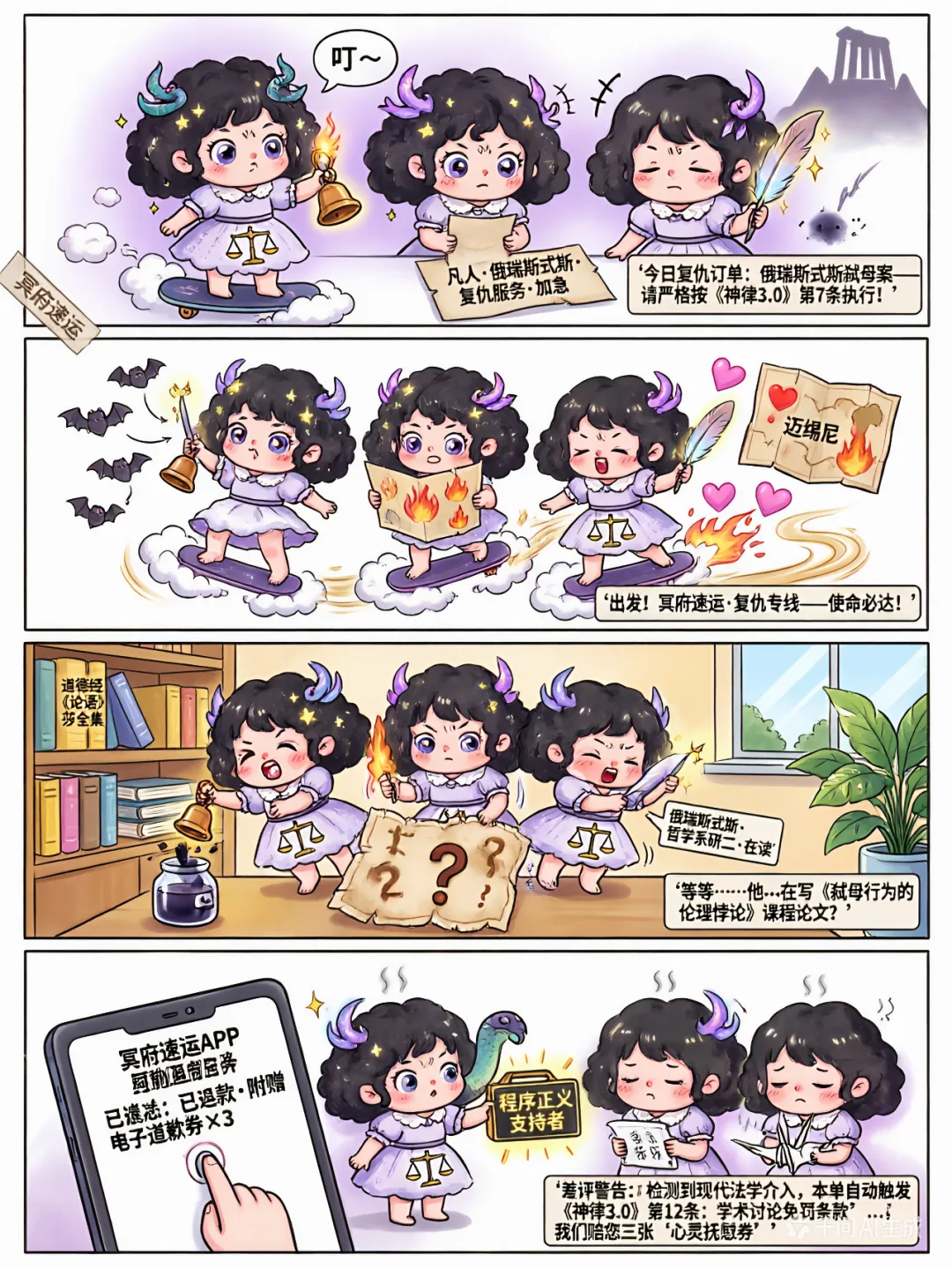 "text": "‘今日复仇订单:俄瑞斯忒斯弑母案——请严格按《神律3.0》第7条执行!’"