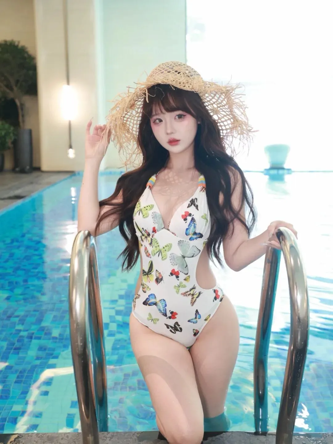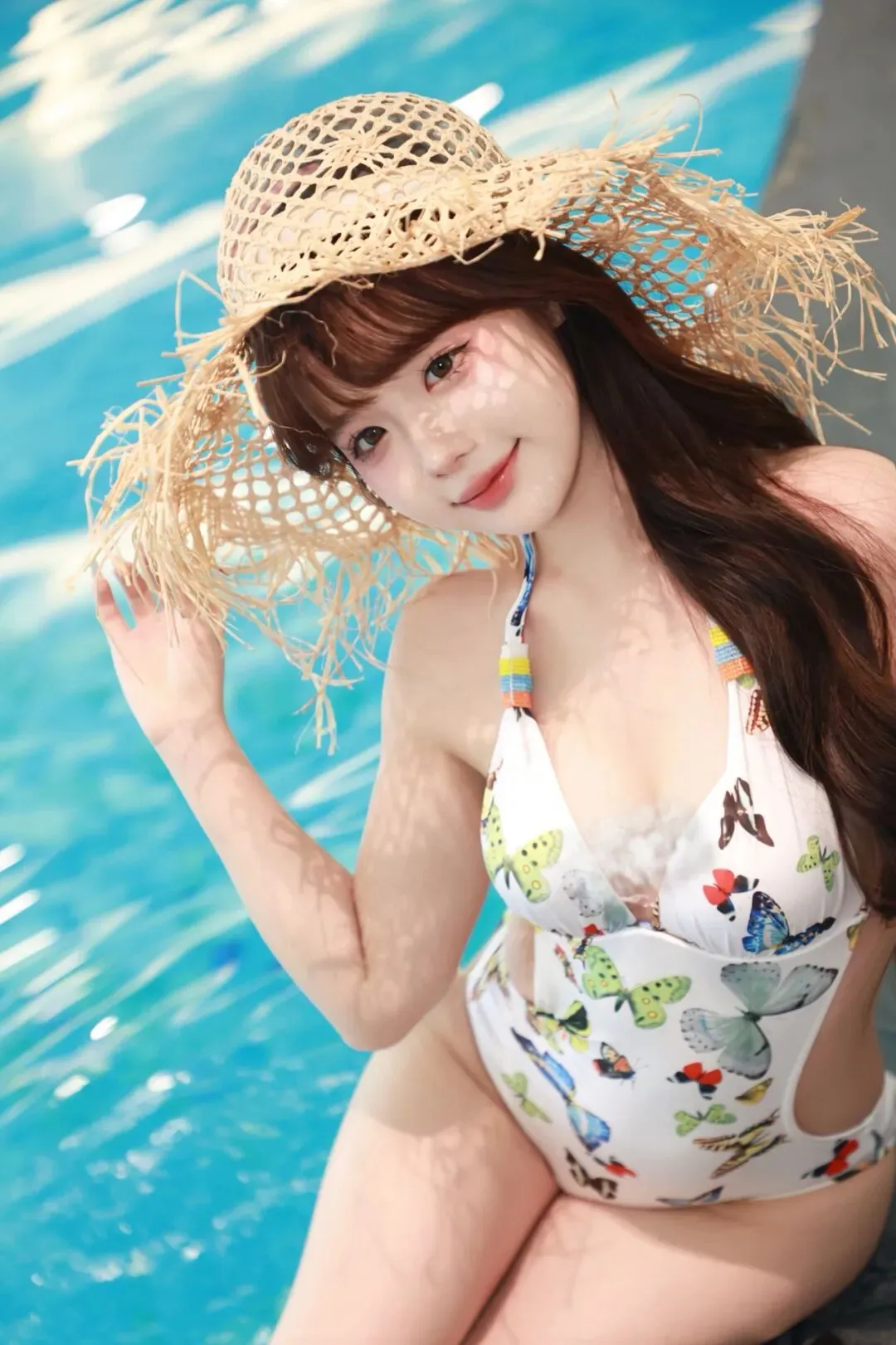 拍照注意事项:泳池边拍照别硬凹,身体微微侧转能藏住腰腹赘肉,利用草帽的镂空光影柔化面部线条,手扶池边或草帽的小动作更显松弛,别正对镜头,让水的反光自然提亮肤色