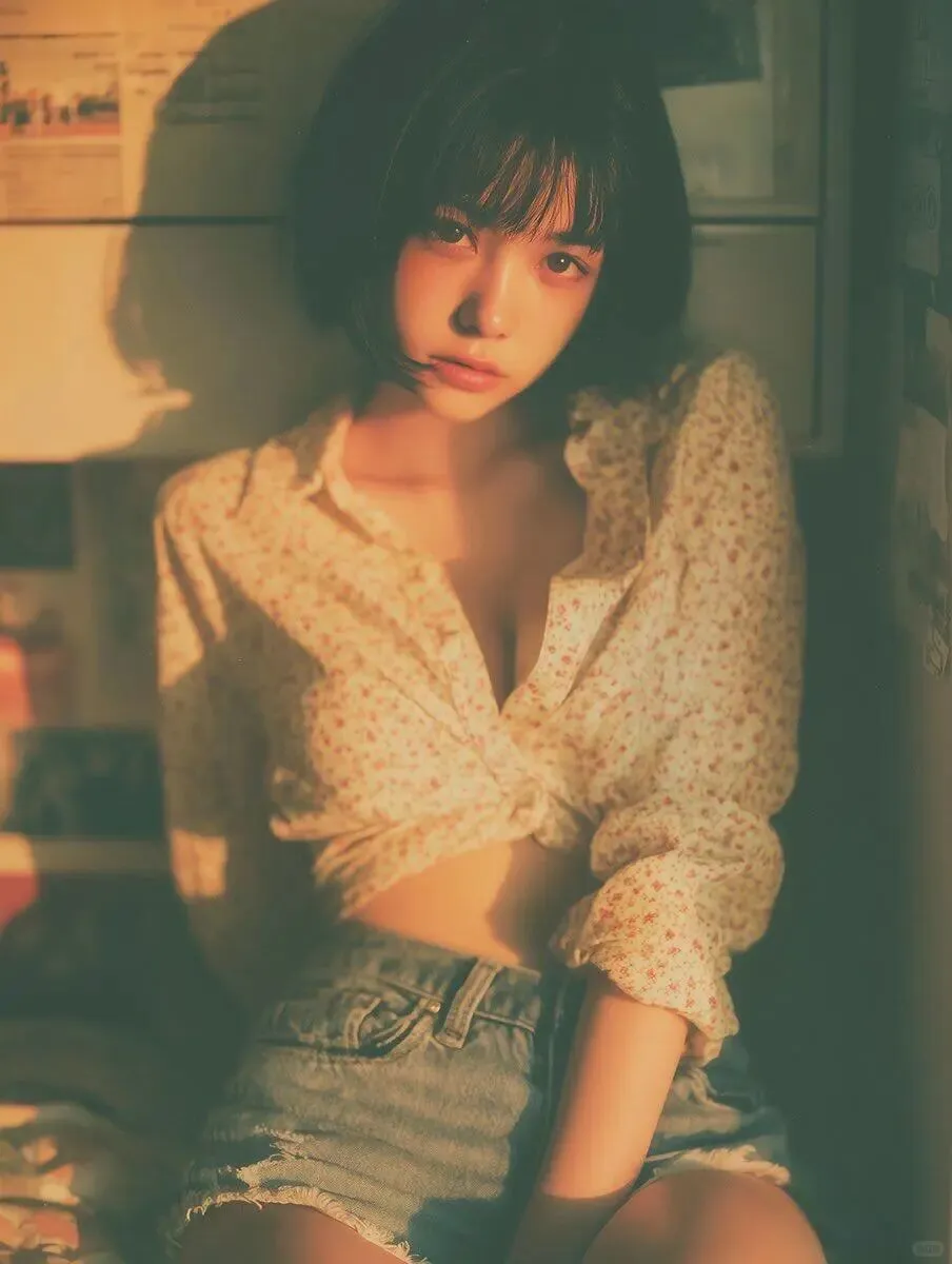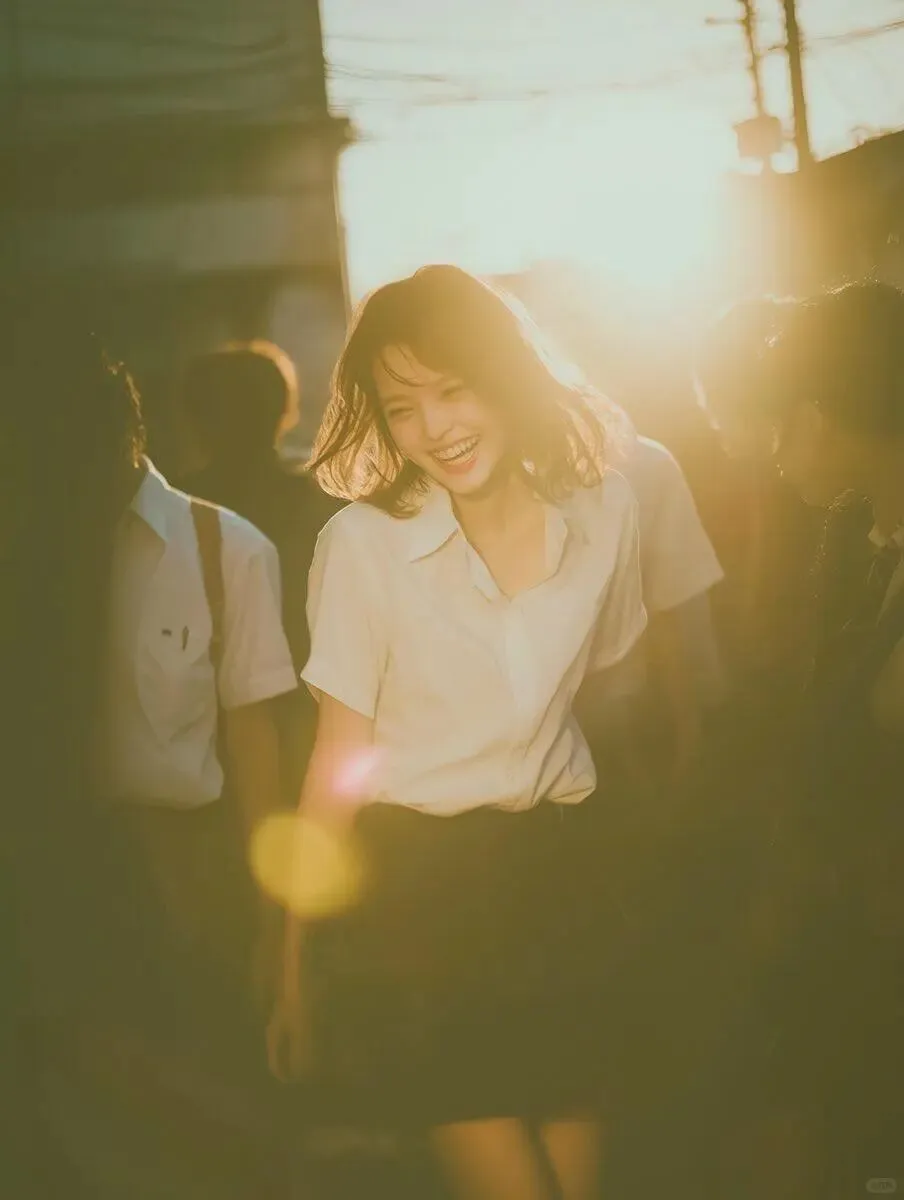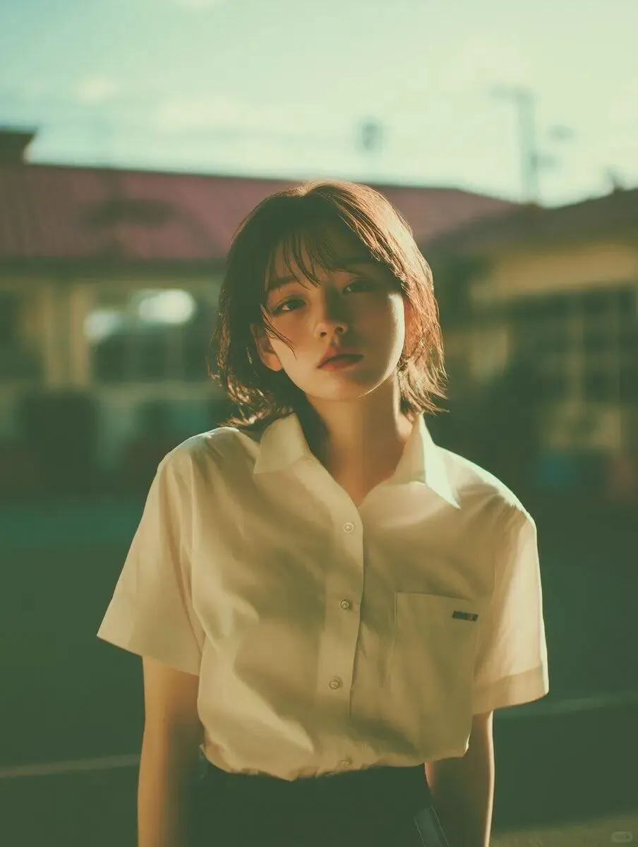 很多时候照片显乱,是因为衣服颜色太杂。这组照片的穿搭逻辑非常清晰,主打清爽干净。白色是永远的神,无论是白色短上衣配短裙,还是简单的白 T 恤,都能很好地反射光线,充当天然的反光板。下身搭配牛仔短裤或深色百褶裙,经典不出错。像第一张那样,把衬衫下摆打个结,露出一点腰线,既显高又带点小性感。避免大面积的印花和logo,纯色最能突出人物的情绪。配饰也不需要多,一条简单的项链或耳环点缀即可,重点是突出你本身的气质,而不是让衣服抢了风头。