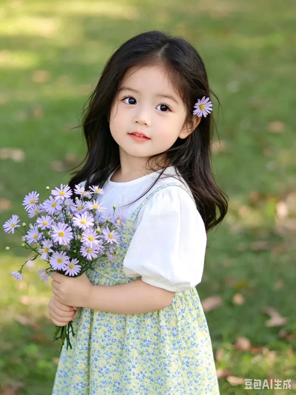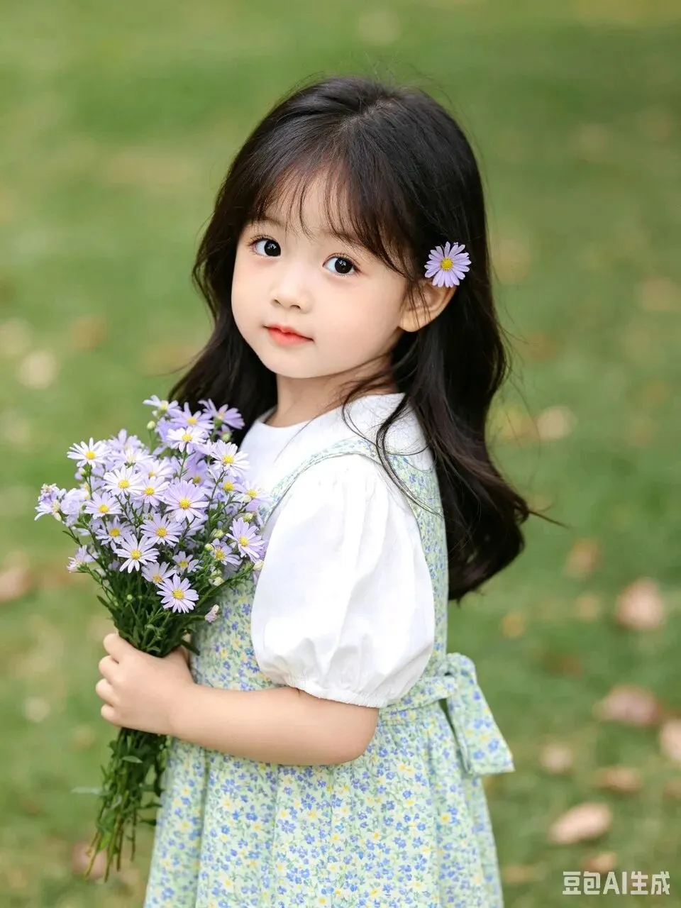 一个亚洲小女孩,大约五六岁,处于画面中心偏左位置,她正侧身站立,手里捧着一束淡紫色的小雏菊花束。女孩拥有一头乌黑亮丽的长发,部分散落在肩头,右侧的头发上别着一朵淡紫色的小花。她的脸蛋圆润,有着一双明亮的大眼睛,瞳孔漆黑,眼睫毛浓密,鼻梁小巧,嘴唇微抿,带着一丝天真好奇的表情。她穿着一件白色泡泡袖上衣,搭配一条浅绿色碎花连衣裙,裙子上点缀着密集的浅蓝色和黄色小花图案。