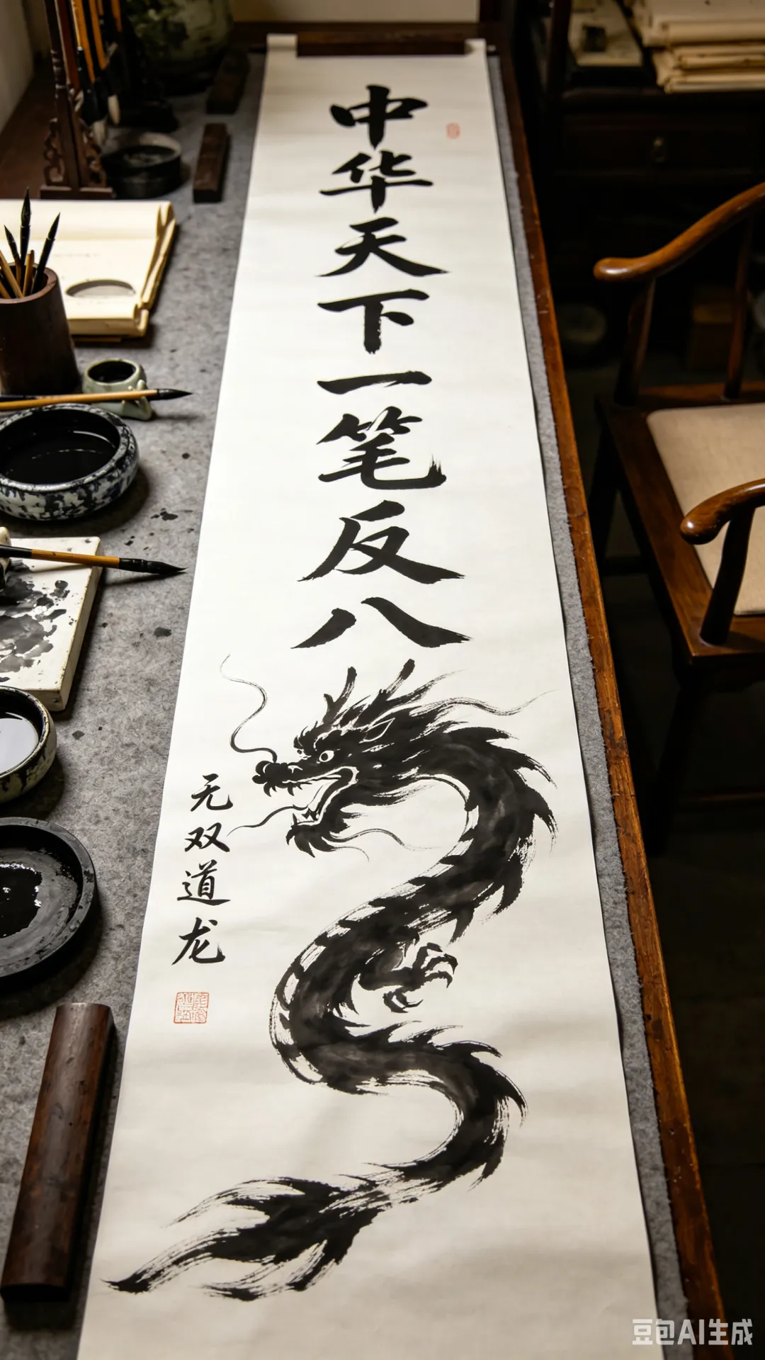 时有无双道龙,祥瑞红凤,踏祥云而远至,沐瑞气以同游。览宝岛之风光,心潮涌动;赏南疆之胜景,情意绵长。步步寻幽,遍历名区胜景;行行寄兴,轻吟雅韵诗章。感山海之壮阔,抒家国之柔肠;念血脉之牵绊,思两岸之同乡。继而铺长笺,研浓墨,挥巨笔,书龙章。二四长卷,落笔风雷涌动;一笔龙字,藏尽华夏刚强。笔走龙蛇,纳九州之灵气;墨凝锦绣,承千载之文脉。