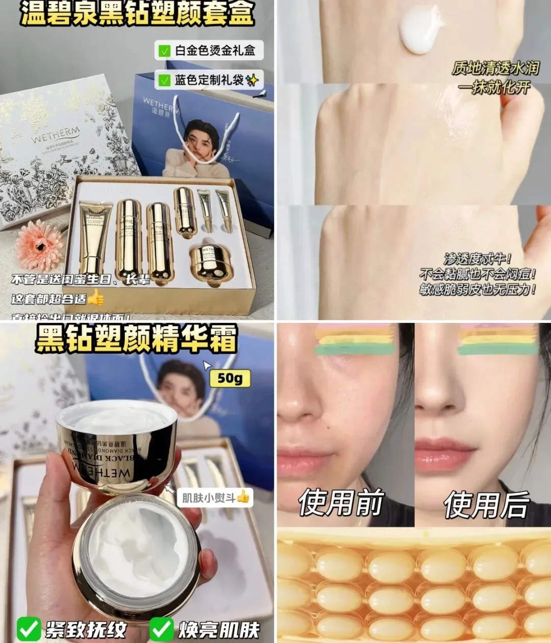 温碧泉新出的黑钻塑颜套装,感觉就是为这个“事业阶段”量身定制的。它是正经的抗衰线,不是什么基础保湿,一套把洁面、水、乳、眼霜都配齐了。专门针对皱纹、松弛和暗沉