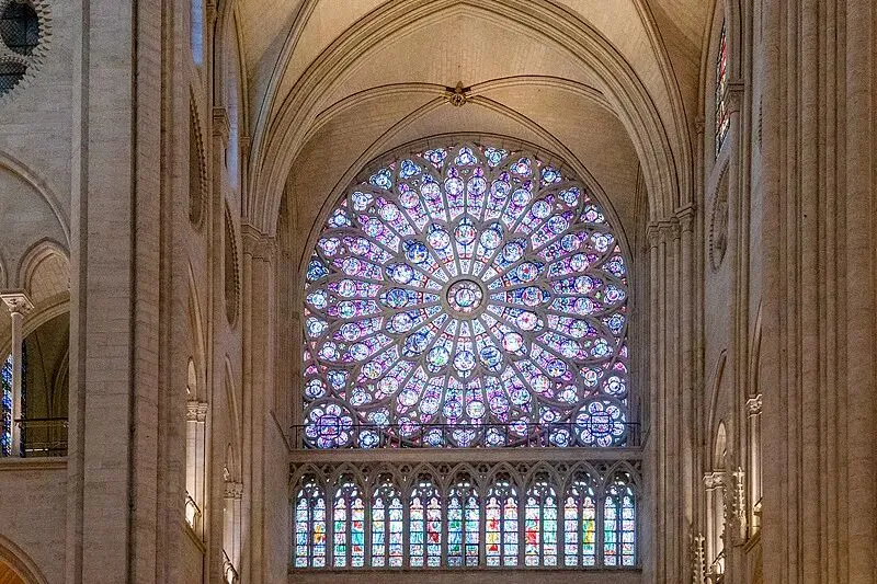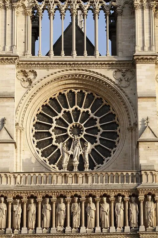 巴黎圣母院:玫瑰花窗、飞扶壁、柱廊大量雕刻三瓣鸢尾,象征王权与神圣