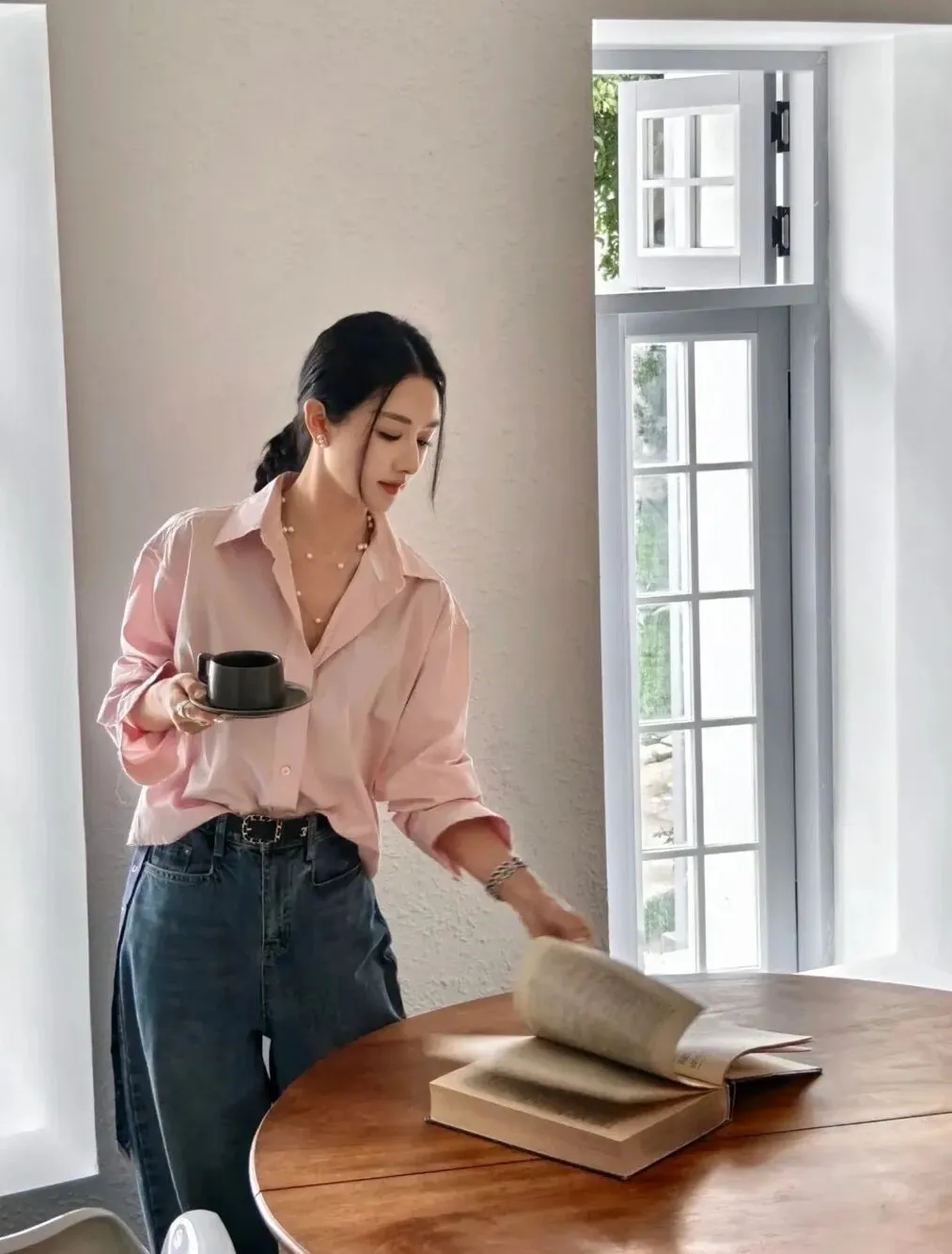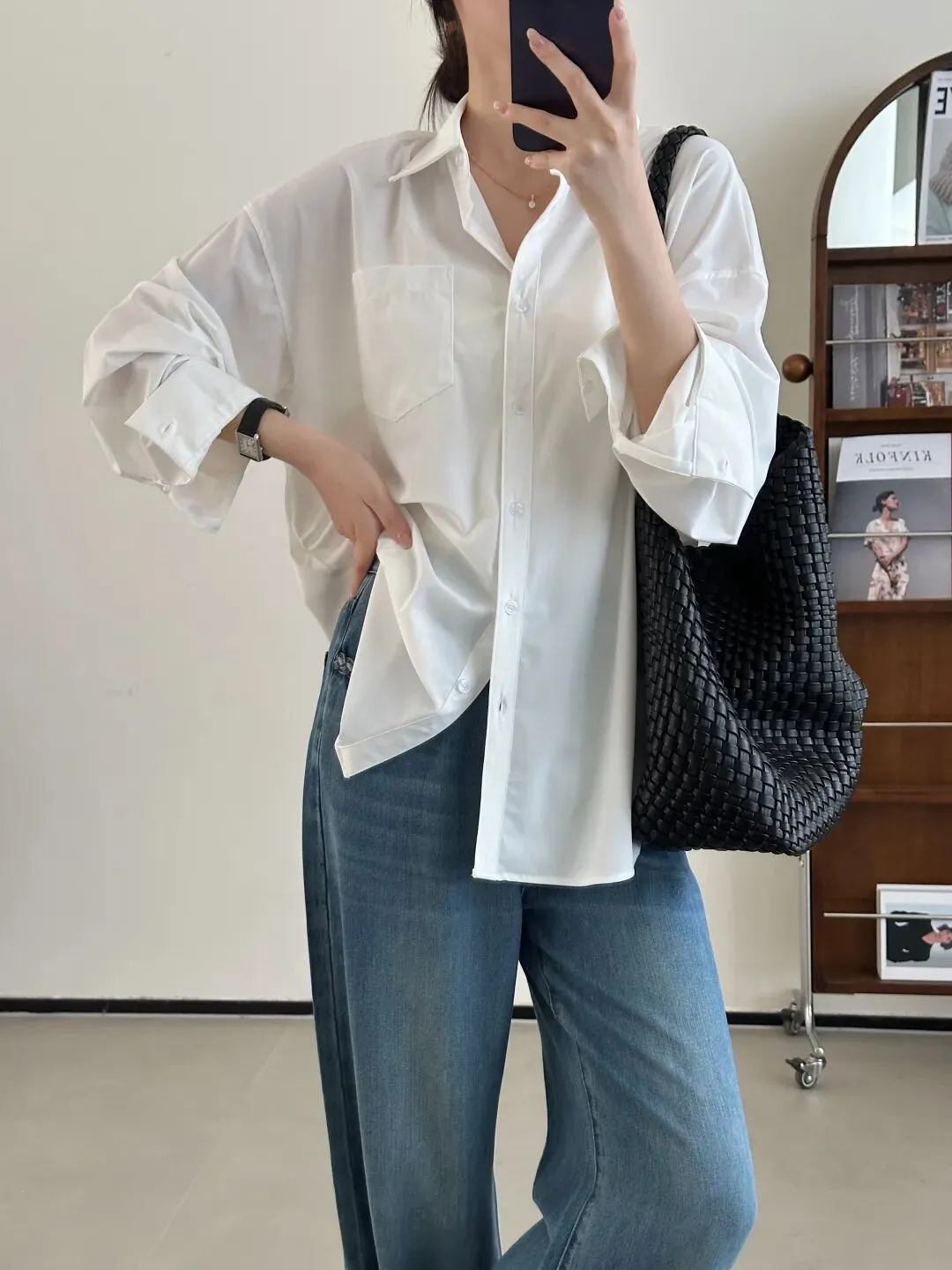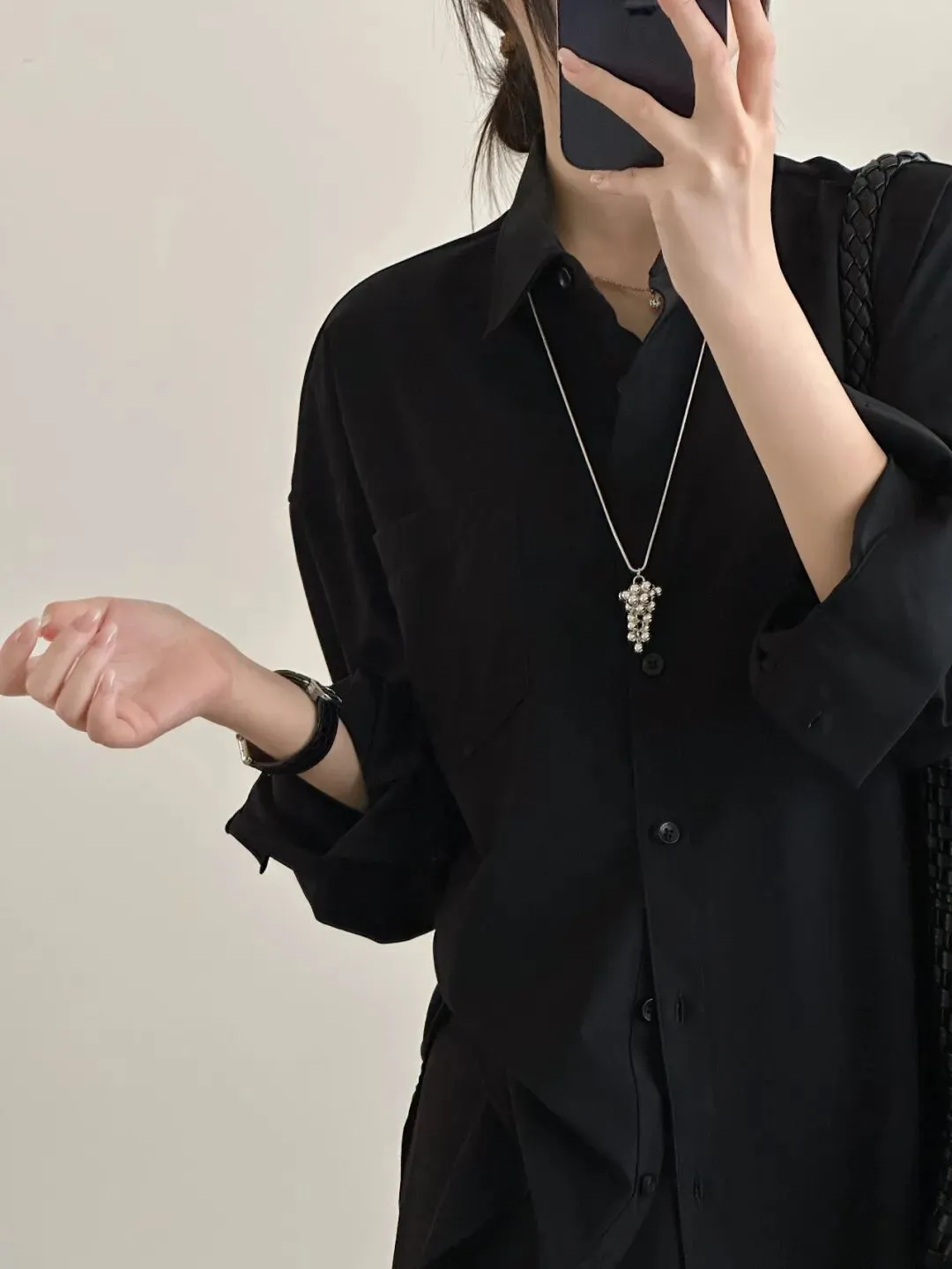 也可以当成职场必备的时髦衬衫,直接单穿,搭配西装裤就很有清冷感了。