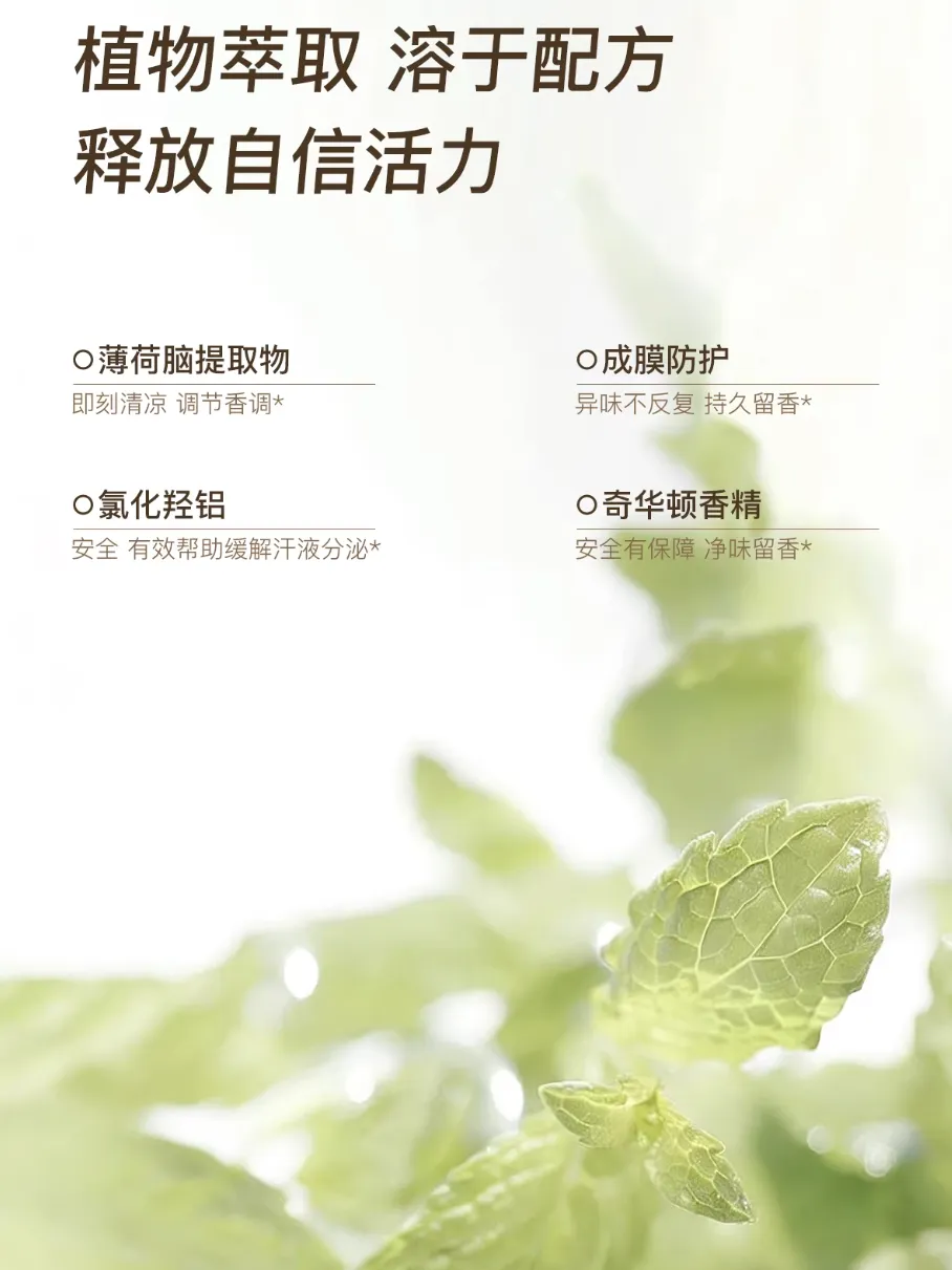 前者负责清凉、调香和清爽,后者则把汗液狠狠限制住,实现物理止汗。