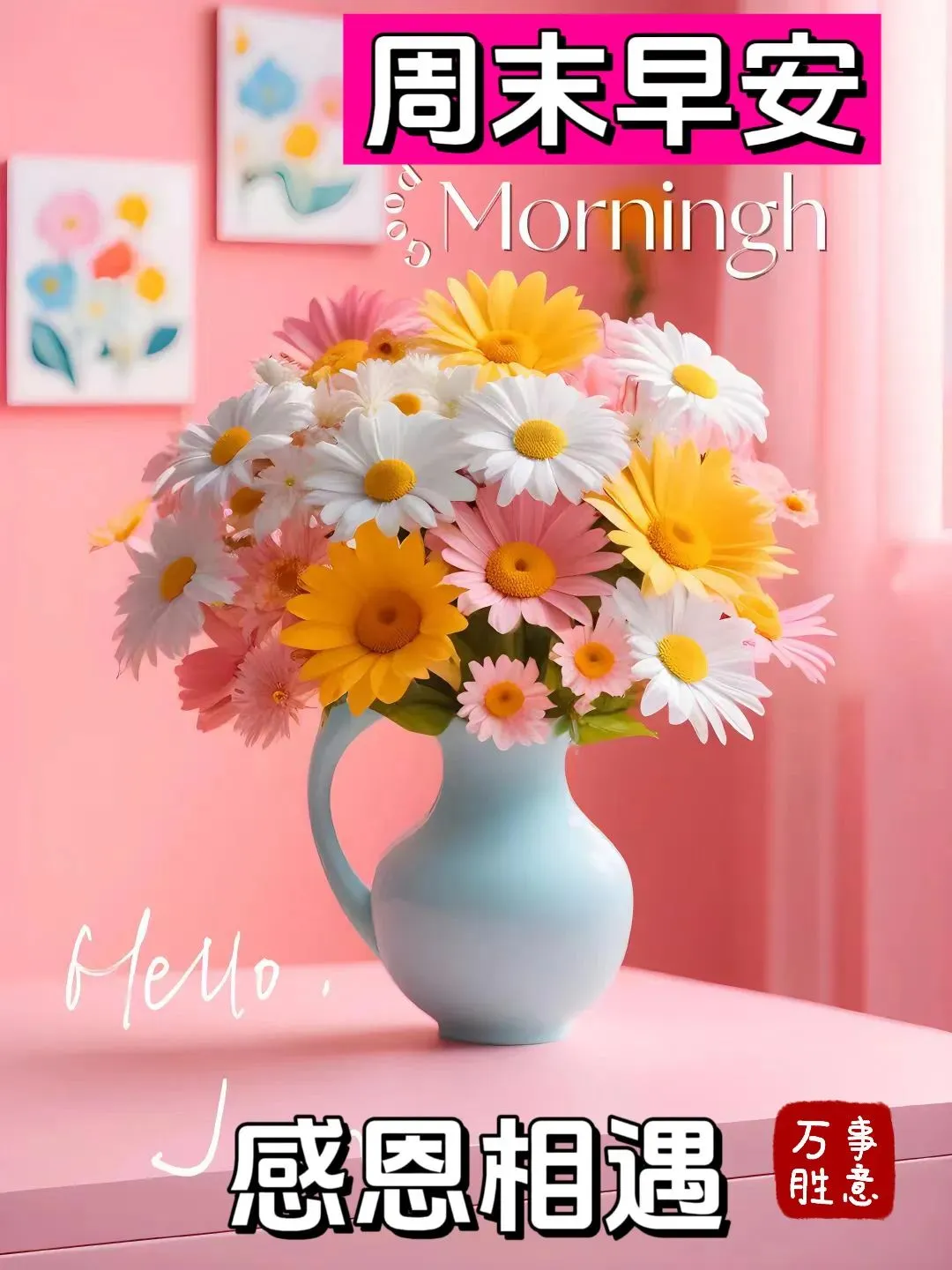 周末又到,向您问个好:办事处处顺生活步步高;彩票期期中好运天天交;打牌场场胜口味顿顿好;家里出黄金墙上长钞票!周末早安!🌹❤️🙂🤝🌺🎉