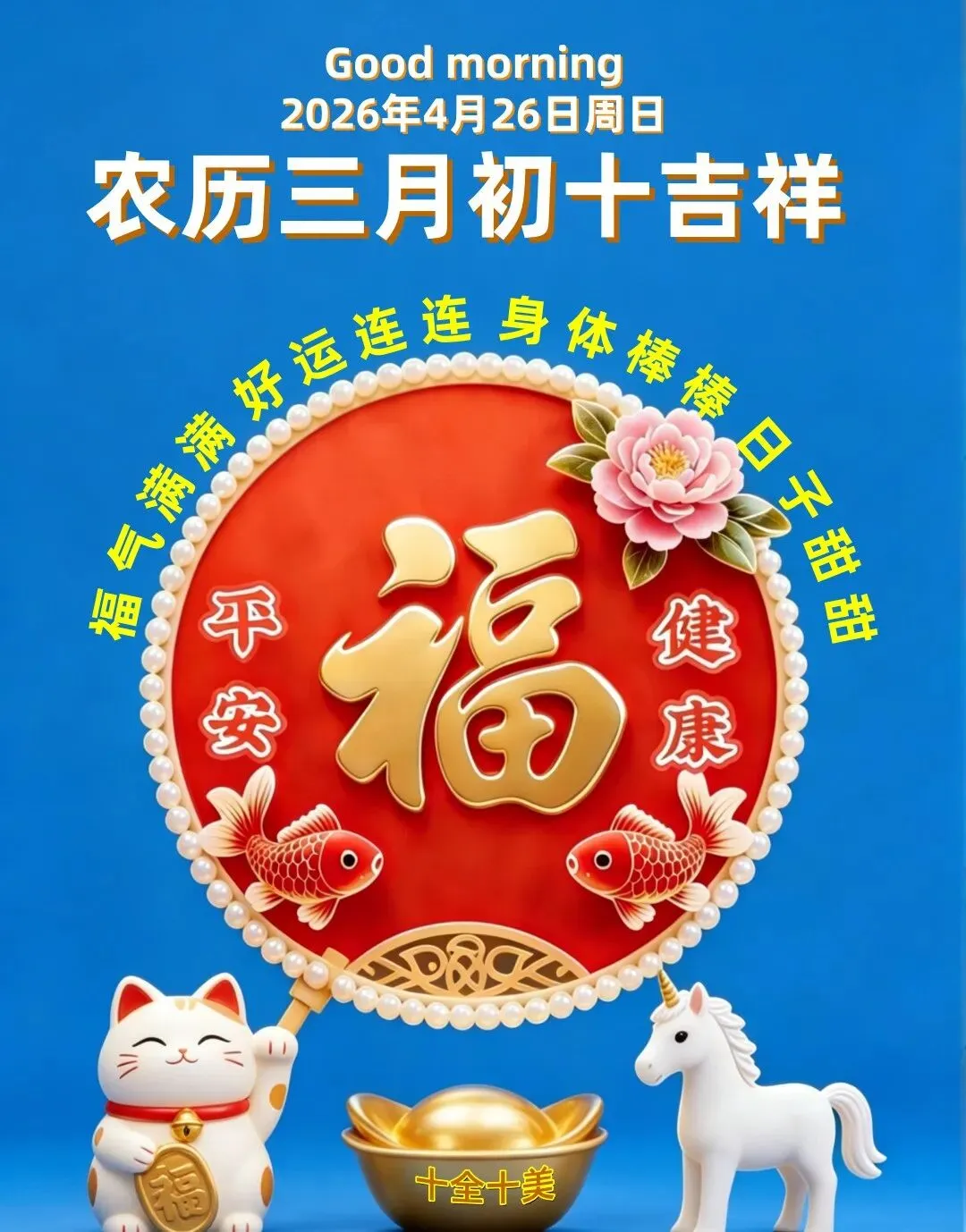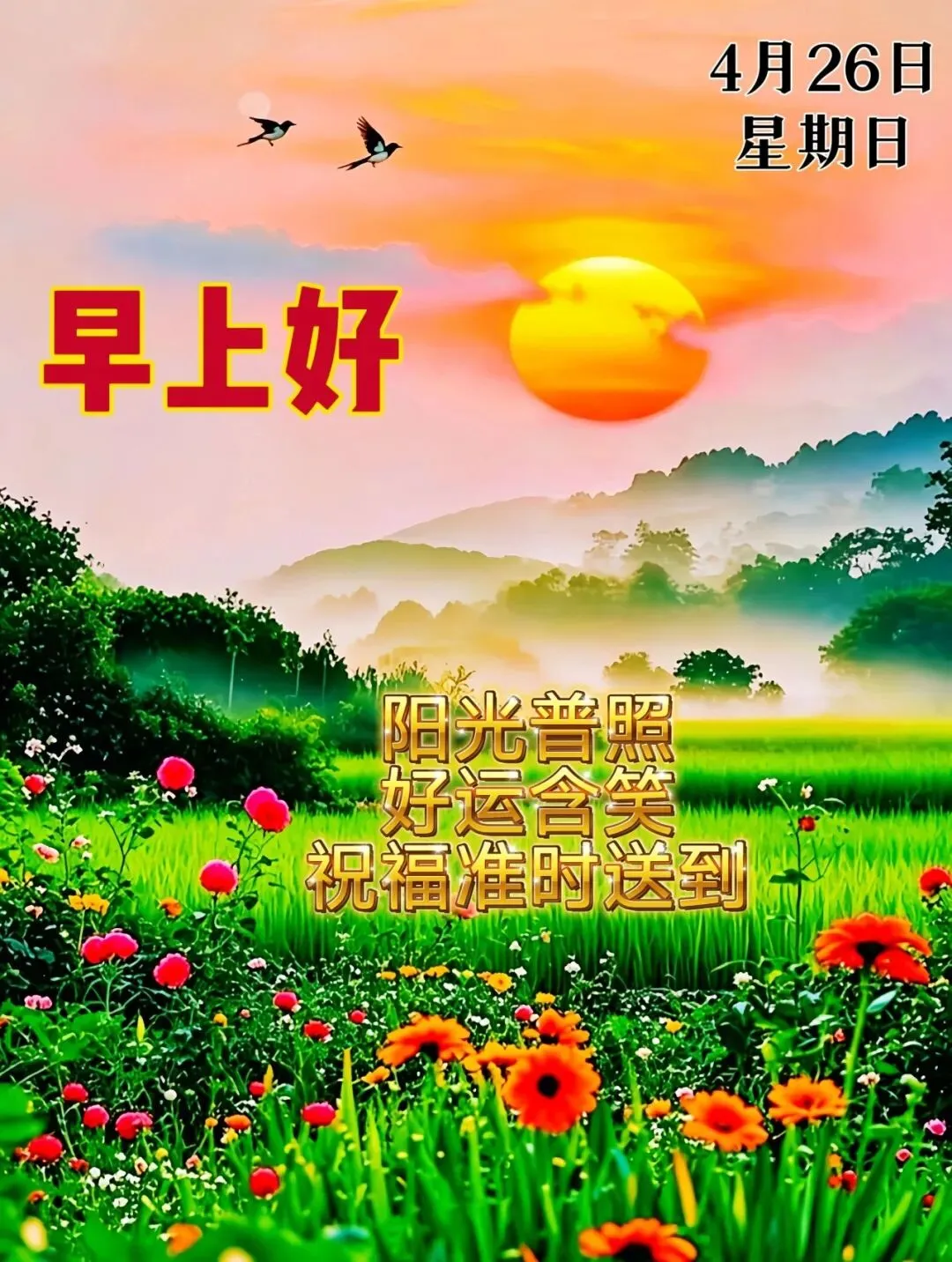 2026年4月26日周日早安祝福图片,愿你身体健康,吃饭香甜,每天心情愉快,事事顺心,万事如意!