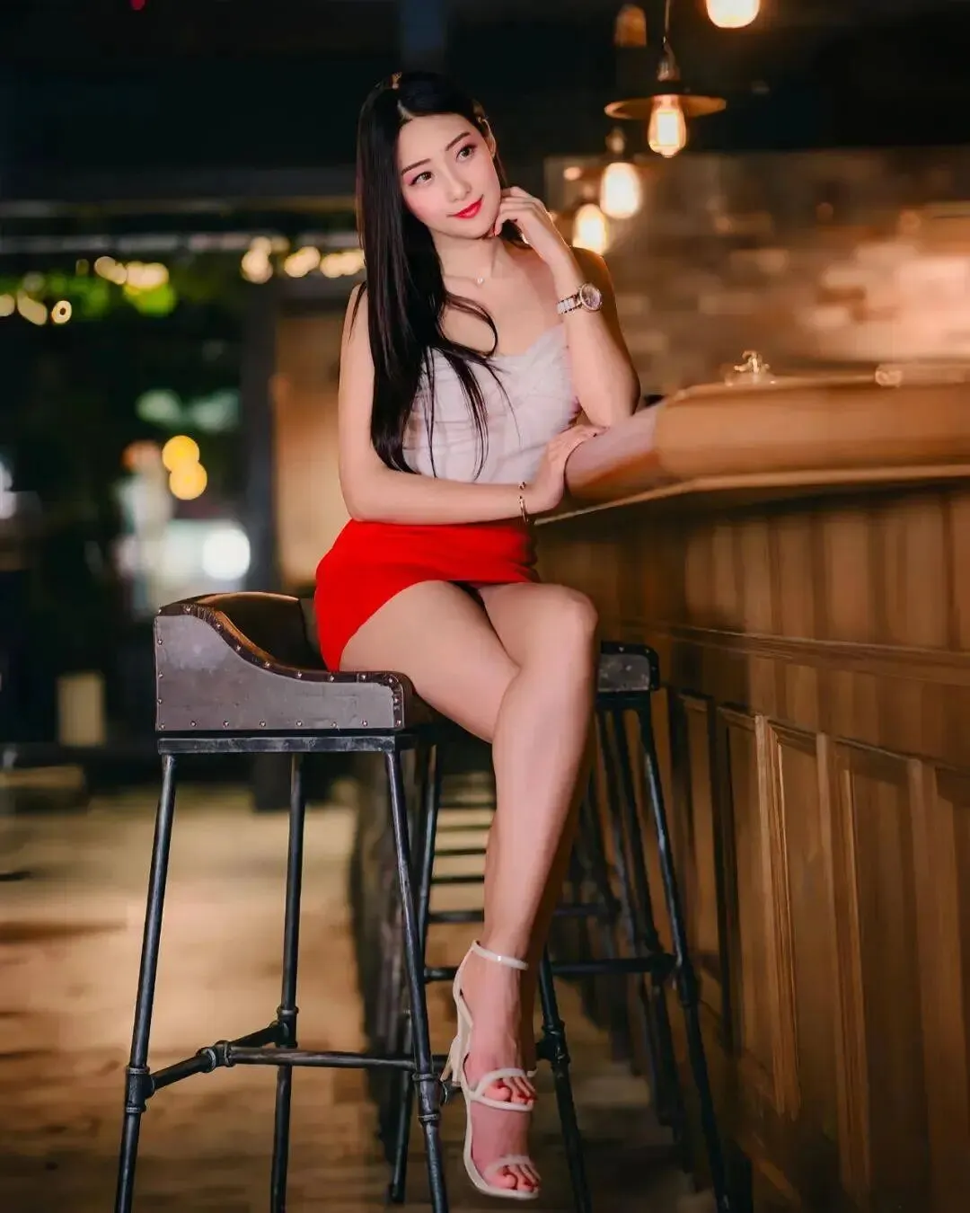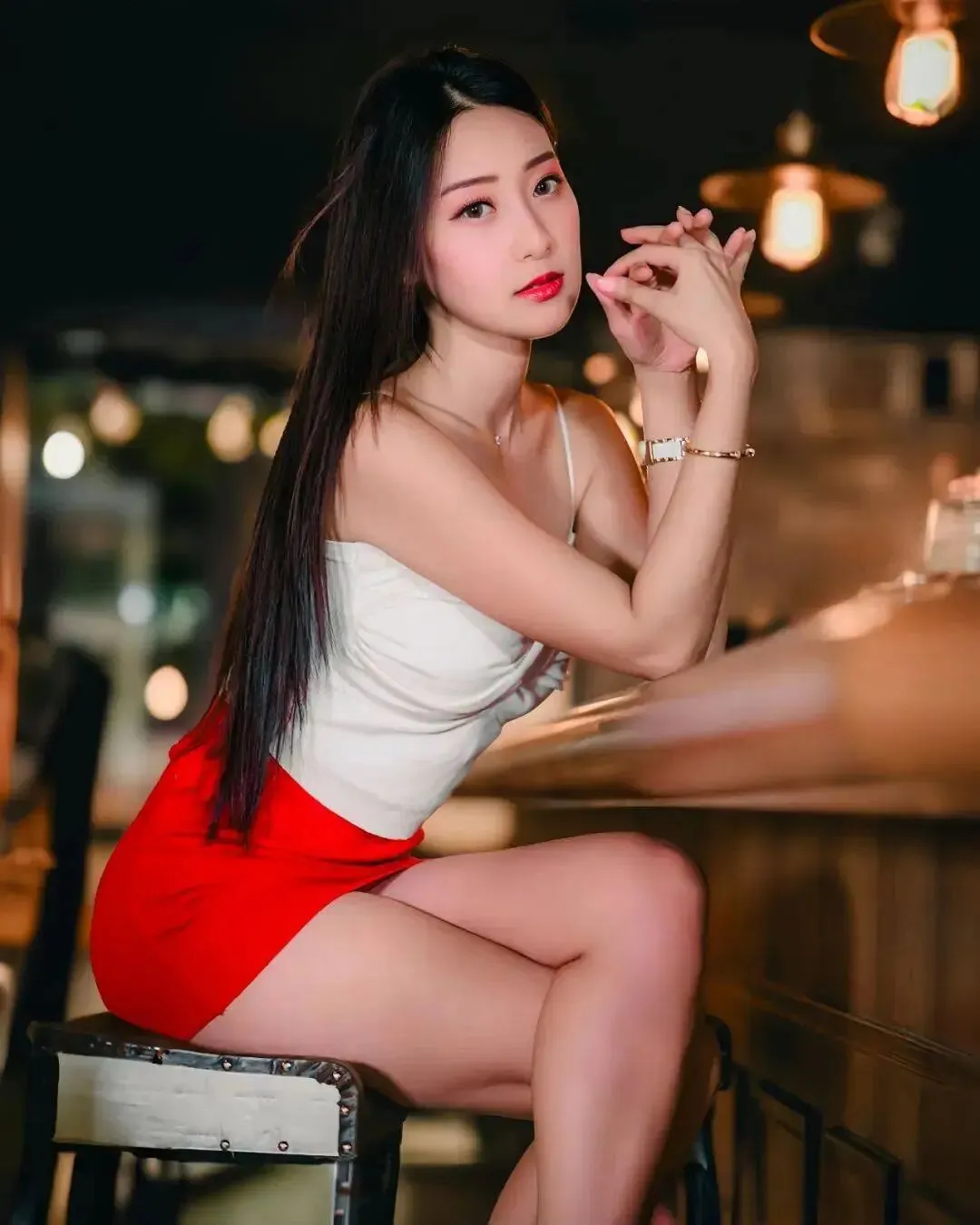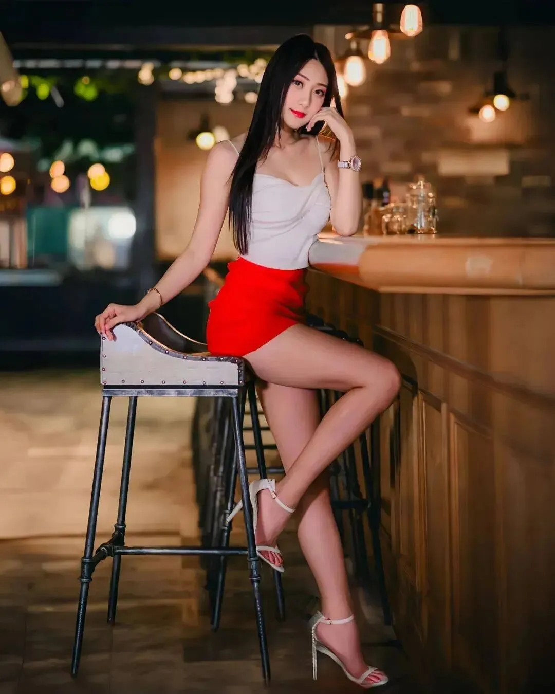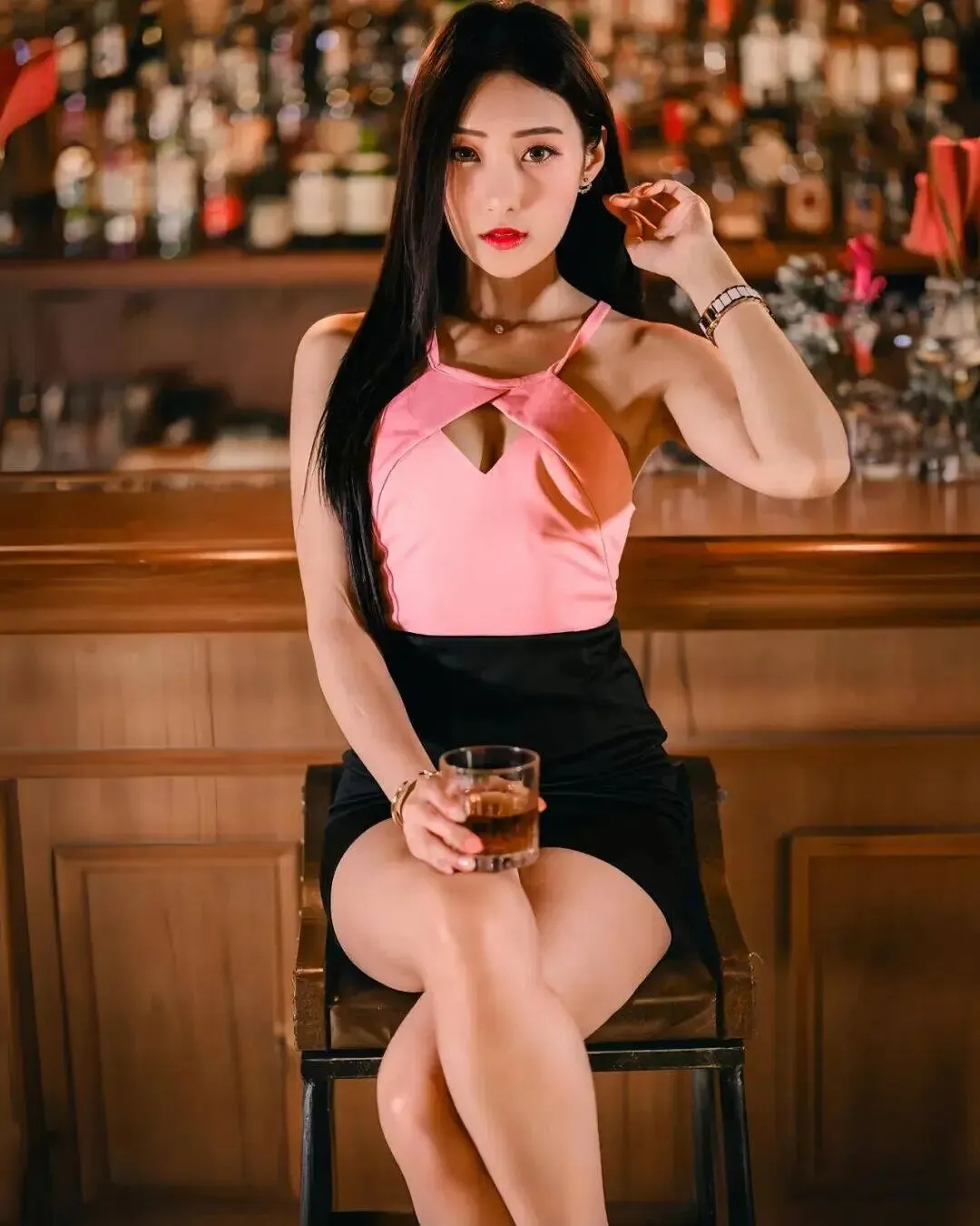 一身黑色修身长裙完美勾勒出腰臀曲线,腿上一双若隐若现的黑丝,搭配红色细高跟,每一步都像是踩在心跳节奏上。她是那种典型的生人勿近的高冷御姐范儿,红唇微张却又带着几分无辜的纯欲感。当酒杯轻轻碰在一起时,眼神里的光芒比酒精更撩人,那种不经意间流露的性感,简直是在疯狂挑战观众的视觉底线,太绝了。哪怕只是坐在那里抽烟,镜头感都强到离谱,这哪里是酒吧,简直是她的秀场。