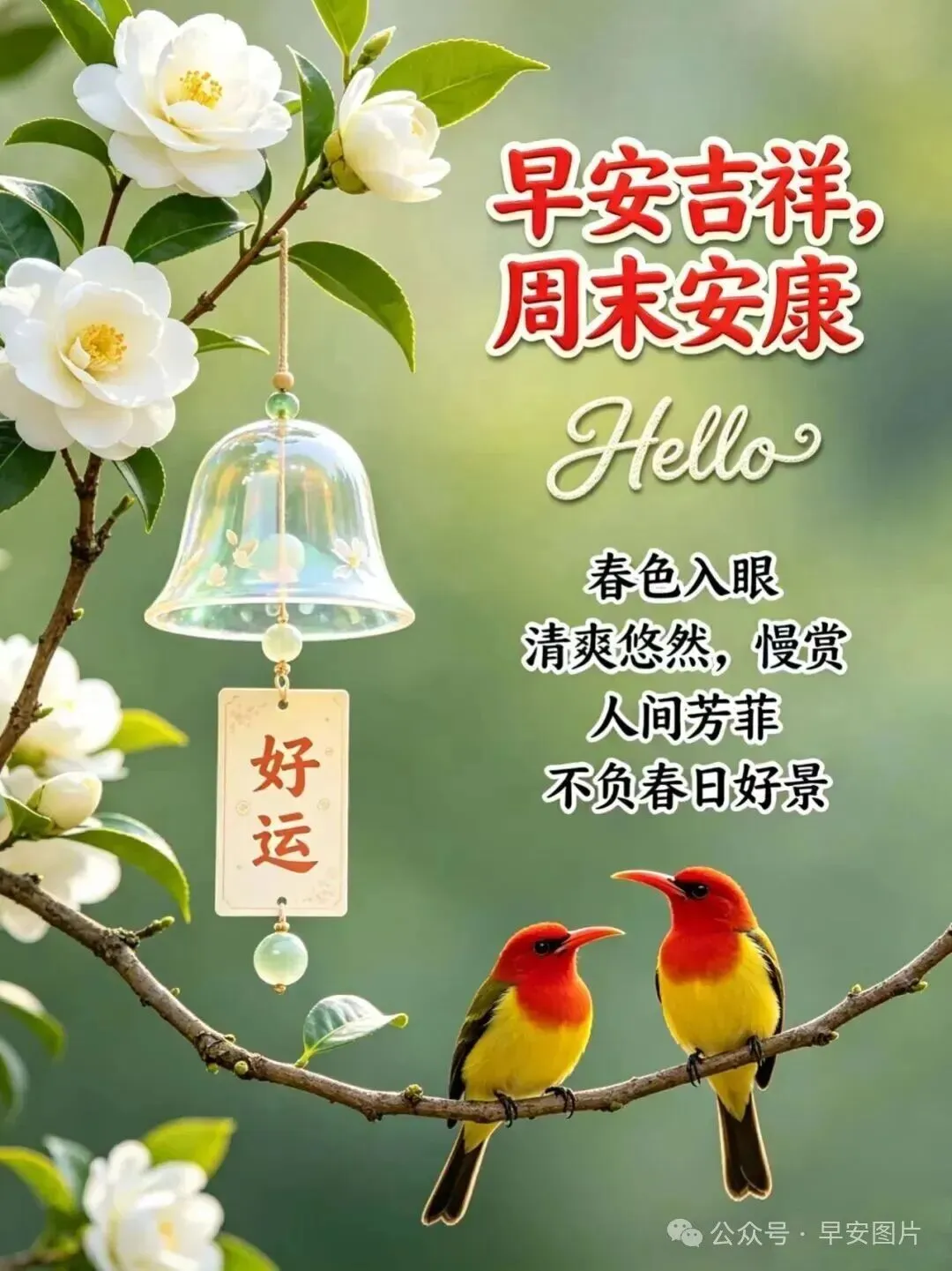 春风拂面🍃,白昼渐长🌅🌿,桃李含笑🌸,柳丝轻扬🌾🌸。清晨送上平安问候🙏,日日欢喜纳吉祥🧧🙏,愿我们岁岁安康🍎,事事顺意✨,周末愉快🎉☀️!