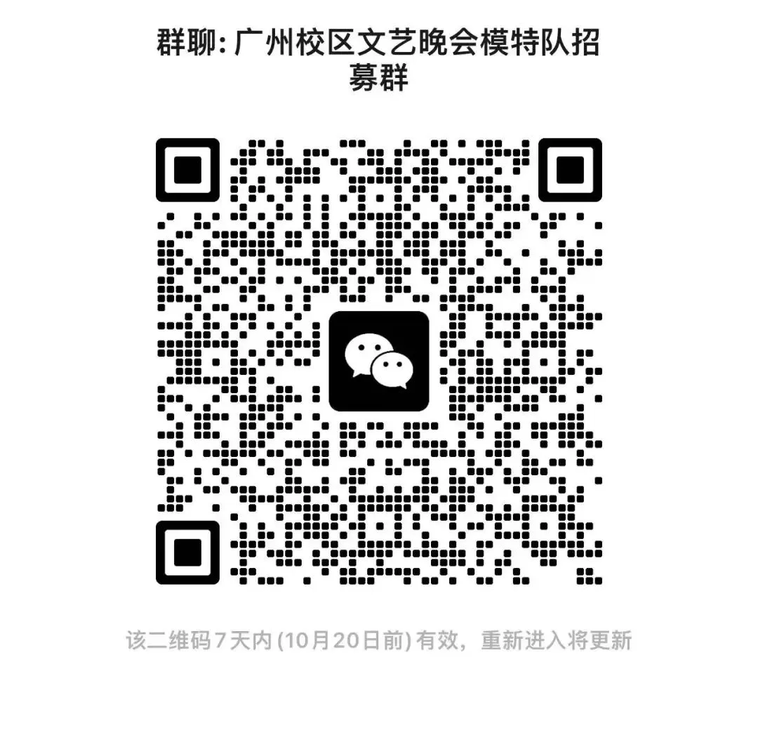 舞台已经就绪,聚光灯正等待着主角登场!无论你是想挑战自我,还是想体验不一样的校园生活,晚会模特队都欢迎你的加入。别再犹豫,本周五 24:00 前,赶紧报名(广州校区),和我们一起在晚会上绽放光芒,留下属于你的精彩瞬间!
