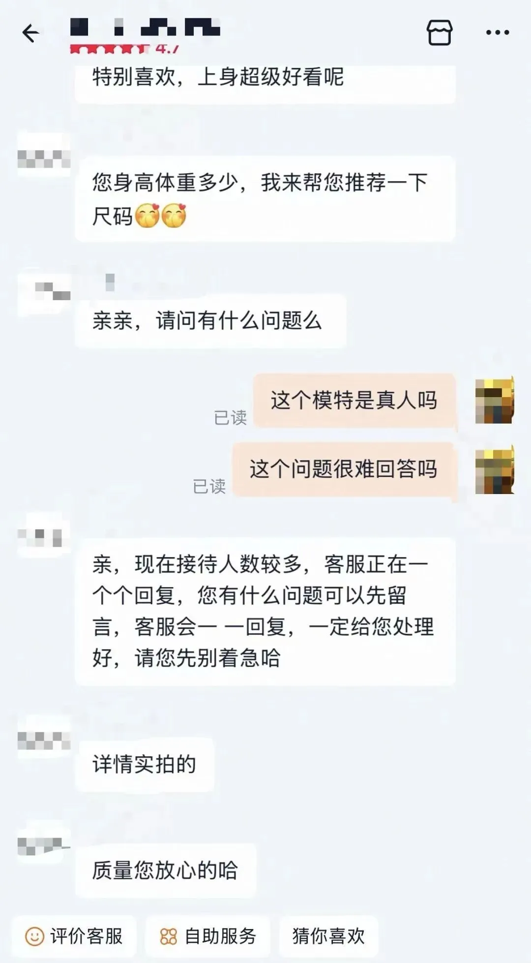 2. 看模特:如果同一个模特出现在N个店铺,或者长得太完美得不真实,要多留个心眼。