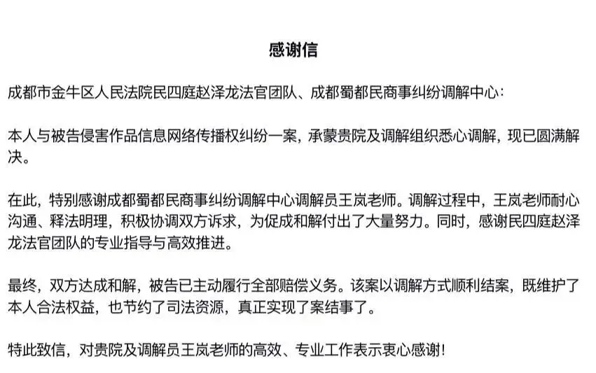经过多次耐心沟通、居中协调,双方终于放下分歧,达成和解协议。被告按约定向原告支付了合理赔偿金,并深刻认识到商用盗图的法律风险;原告对处理结果十分满意,主动向法院申请撤诉。这起涉文旅、涉知识产权的侵权纠纷,最终得以圆满化解。