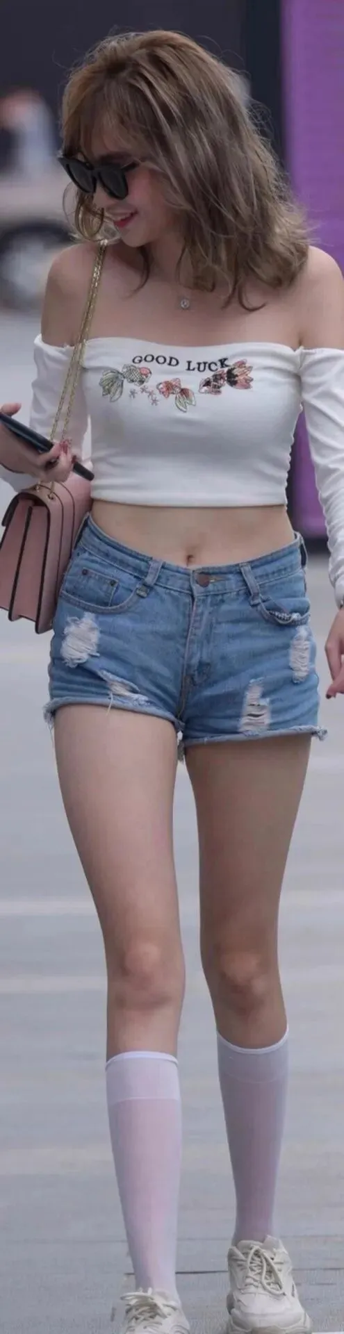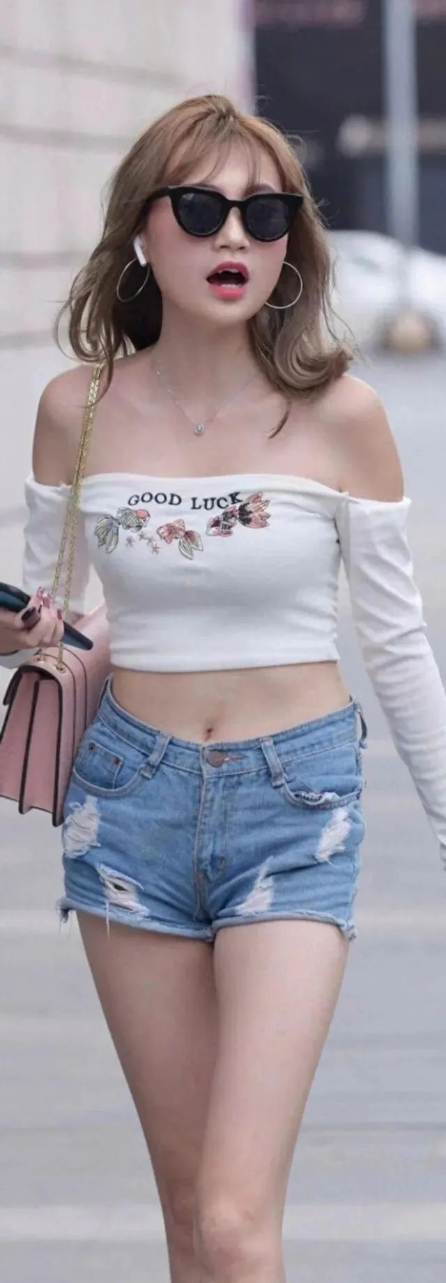 如果你也想尝试类似风格,可以从两个方面入手:第一,不妨优先选择一件具有设计感的核心单品,例如一字肩短上衣或破洞牛仔短裤;第二,通过小配饰来补充“甜”或“酷”的信号,比如粉色包包能增加柔和感,而墨镜则强化街头属性。这样,无论是日常出街还是轻松聚会,都能轻松驾驭,又不失个人特色。