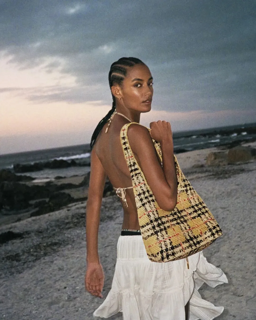 产品方面,2026 仲夏系列以 Burberry 格纹为特色,呈现典藏灵感沙米色,以及茄紫色和矢车菊蓝色等柔和色调;罩衫连衣裙领口采用褶饰和系带设计,彰显系列精品的灵动飘逸特质;男士有领衬衫和短裤采用休闲廓形,尽显匠心巧思。Margate手袋采用马达加斯加酒椰棕榈叶手工编织。鞋履推出Knight Runner低帮运动鞋及Baez、Urchin两款凉鞋,助你尽展夏日格调。