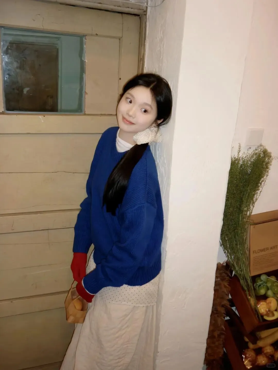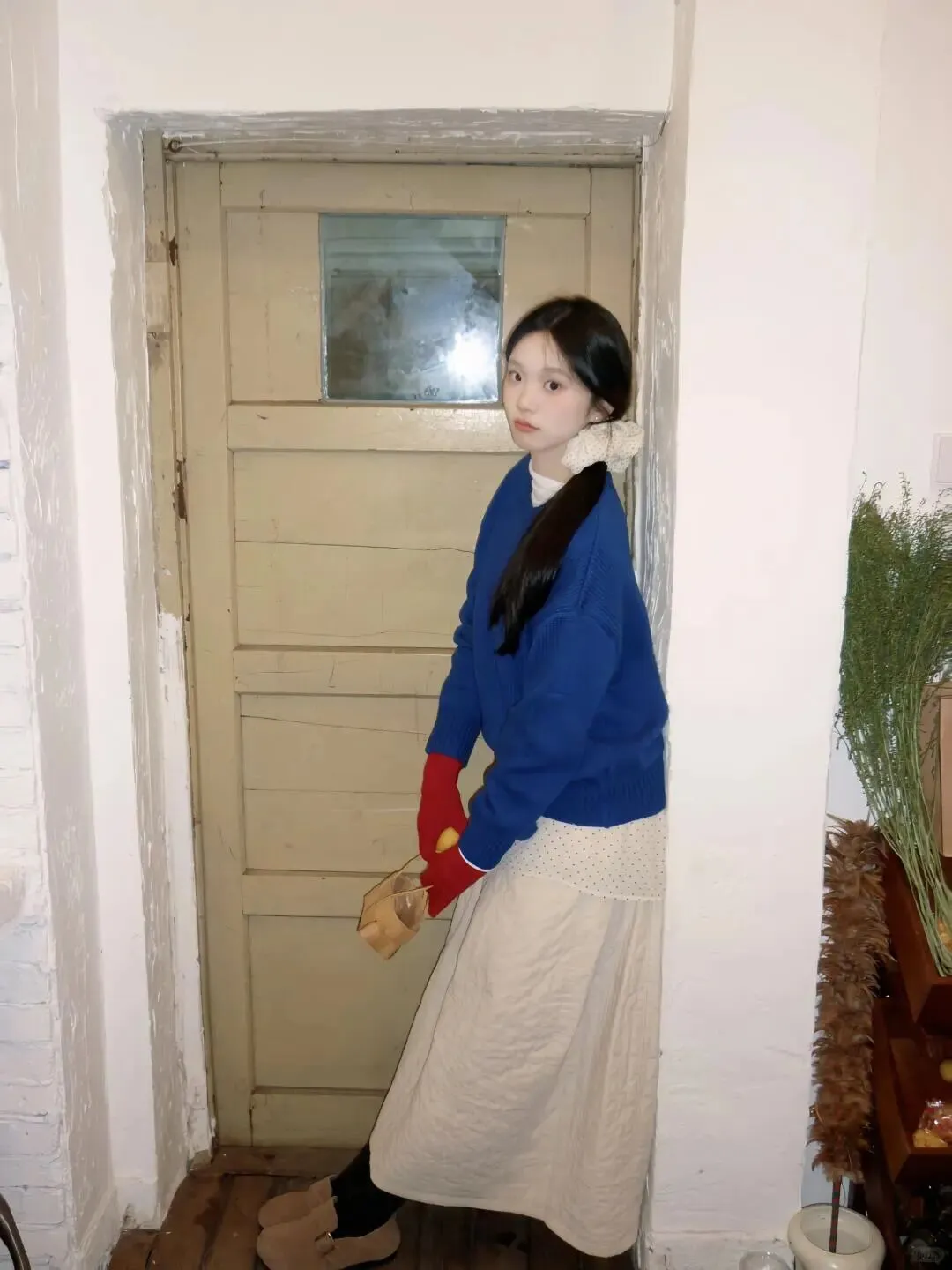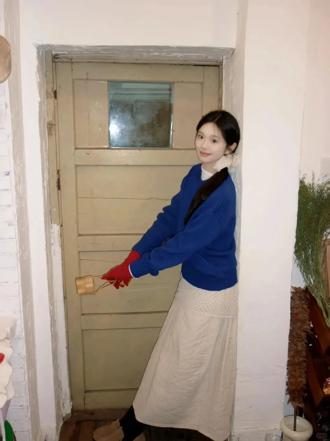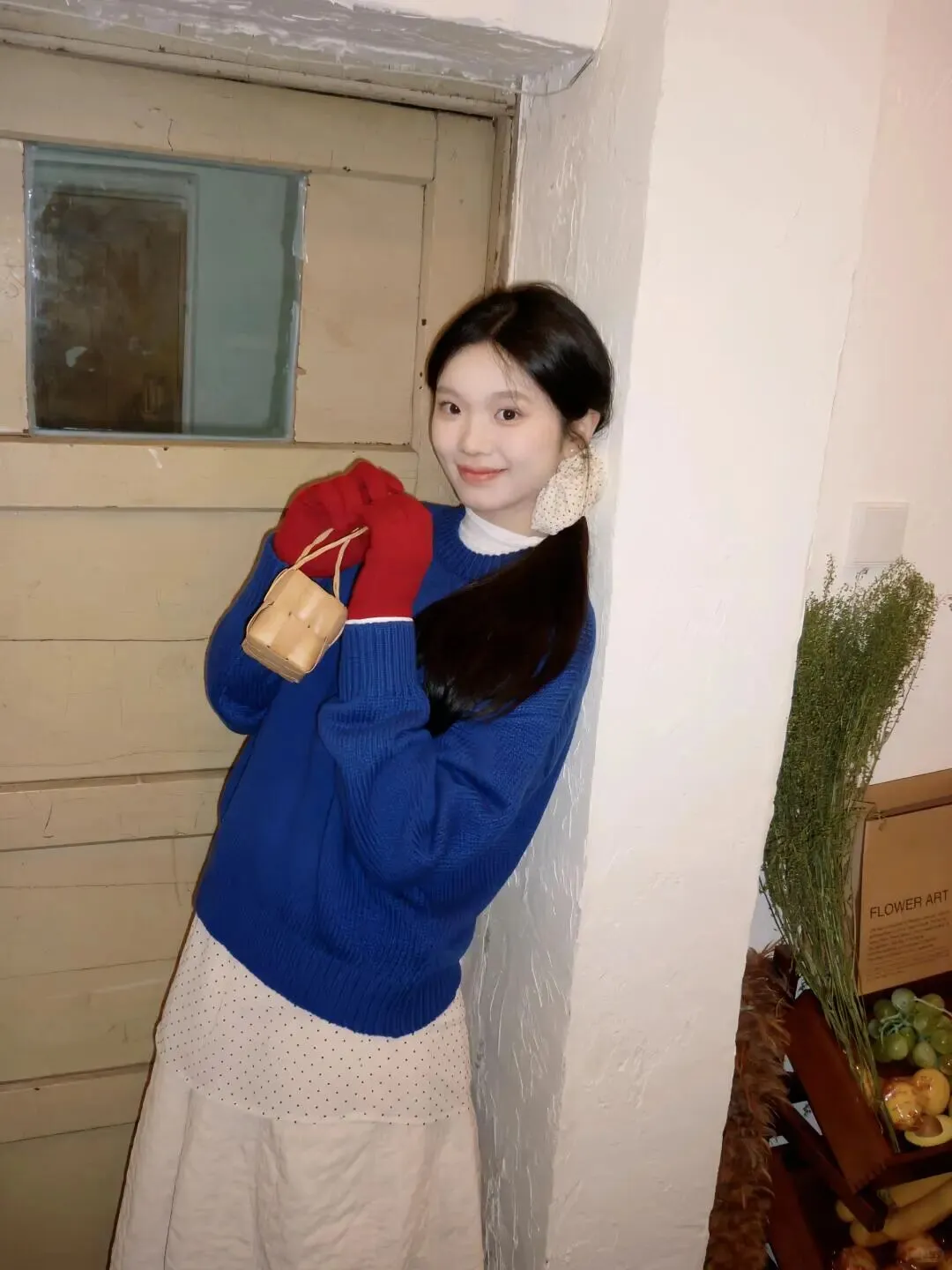 拍照好不好看,第一眼永远是色彩。春天虽然主打清新,但适当的撞色能让画面更跳跃。比如图中采用的蓝色毛衣搭配红色手套,这种经典的冷暖对比非常显白,而且红色手套作为点缀,瞬间打破了大面积蓝色的沉闷。白色内搭和波点裙则起到了过渡作用,让整体造型干净又不失层次。大家在居家拍照时,不妨试试选取一件亮色单品作为视觉焦点,比如围巾、帽子或者手套,这样即使背景简单,人物也能从环境中凸显出来,画面瞬间就有了生命力。