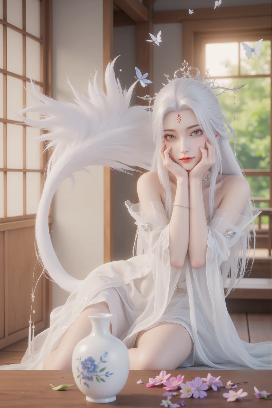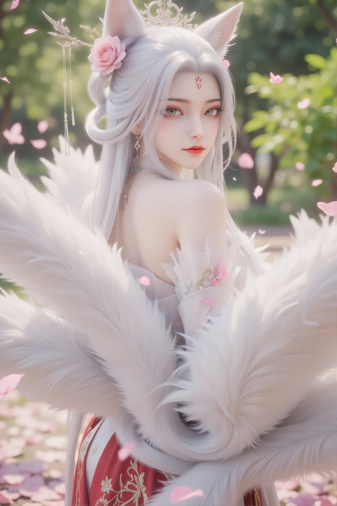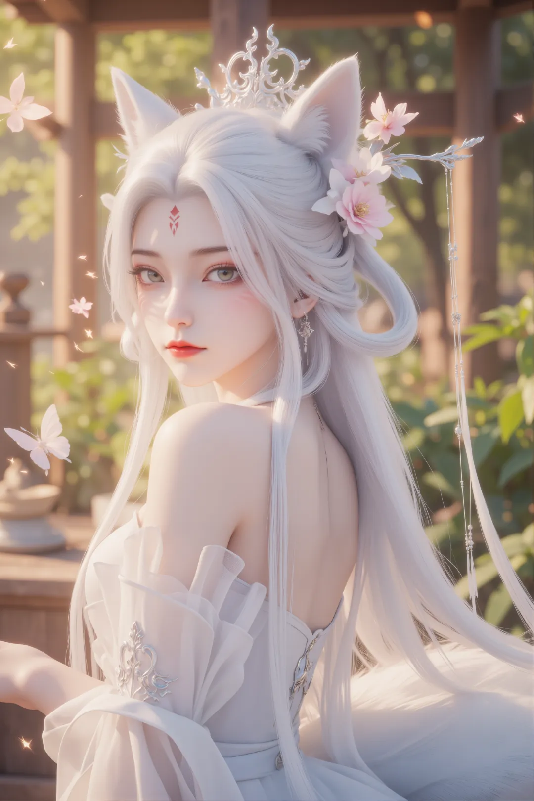 她头顶生有一对毛茸茸的白色狐耳,发间还别着粉色的花朵与银色的流苏发饰,暗示了她非人的身份,同时也增加了几分娇俏与妩媚。