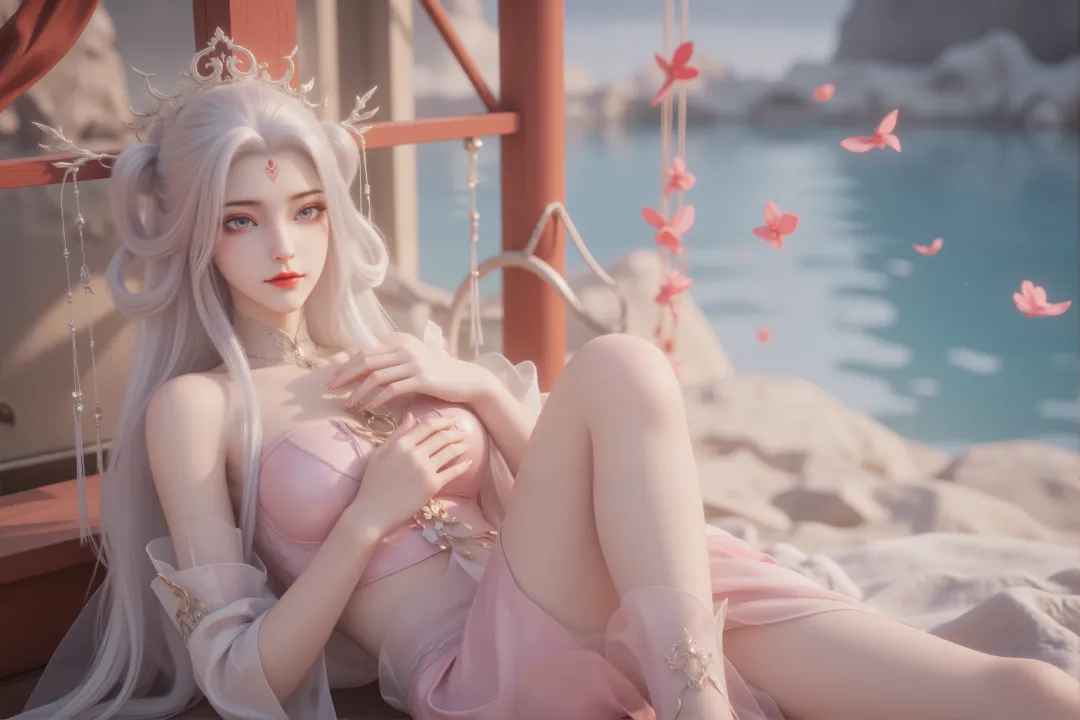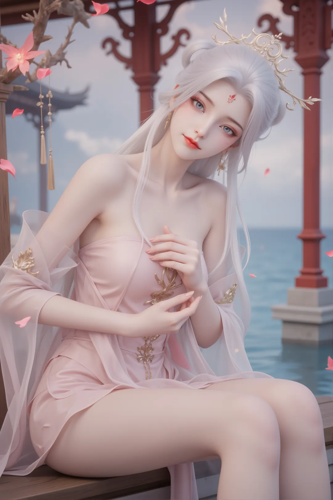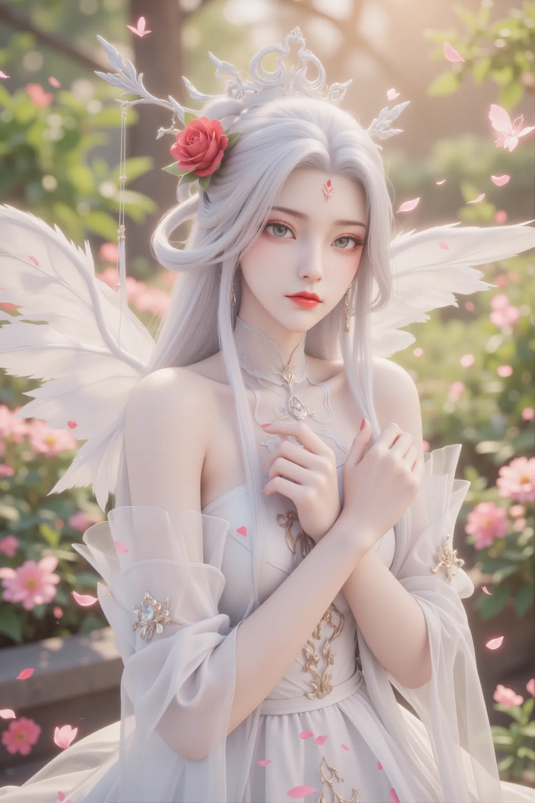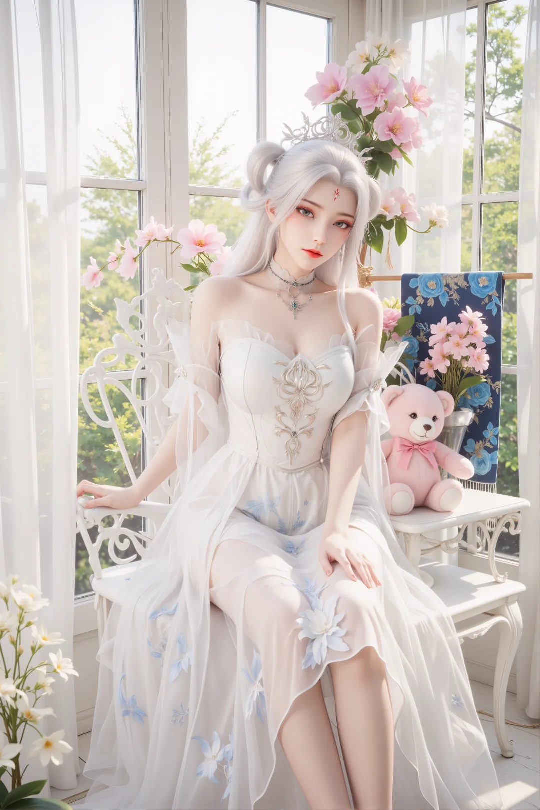 她头顶生有一对毛茸茸的白色狐耳,发间还别着粉色的花朵与银色的流苏发饰,暗示了她非人的身份,同时也增加了几分娇俏与妩媚。