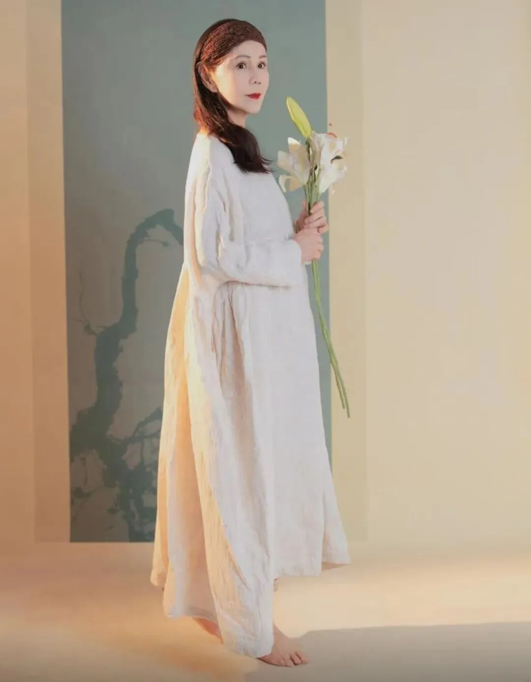 她喜欢素雅的颜色:米白、灰蓝、亚麻色、浅卡其。喜欢棉麻的质地,宽松舒适。