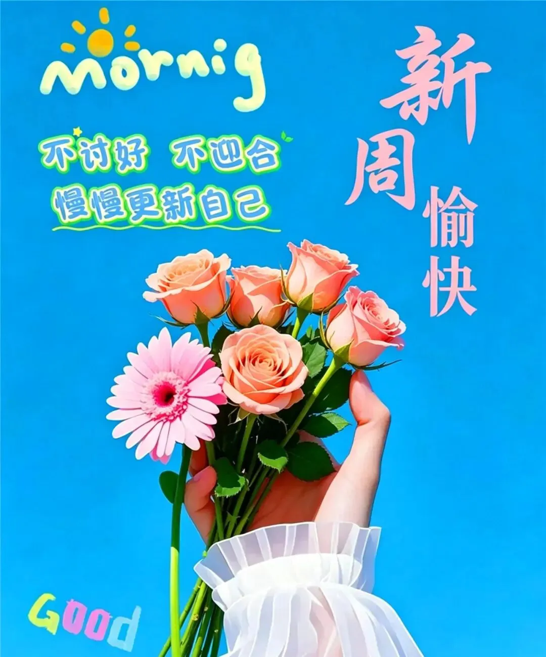 用全新的姿态,迎接最好的自己!无论怎样,把日子过得舒服,才是人生最大的本事!美丽清晨,送上问候三件宝:平安!快乐!身体好!周一早安愉快!