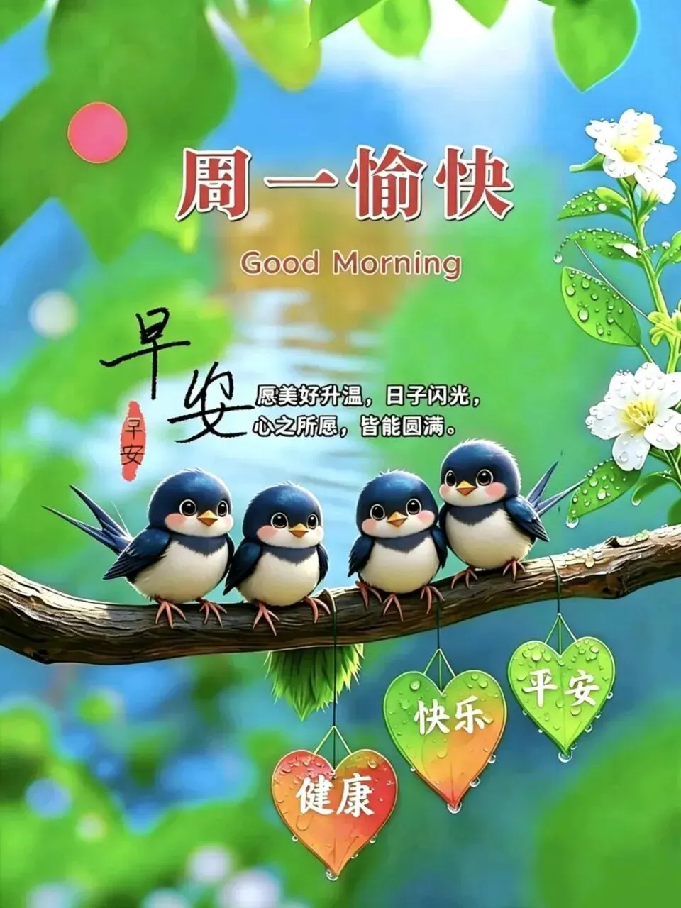 新周问声好,祝你心情好!清晨问声好,万事都美好!愿你工作顺心,生活舒心;愿你好运连连,福气满满!祝你平安健康、万事如意!早安!
