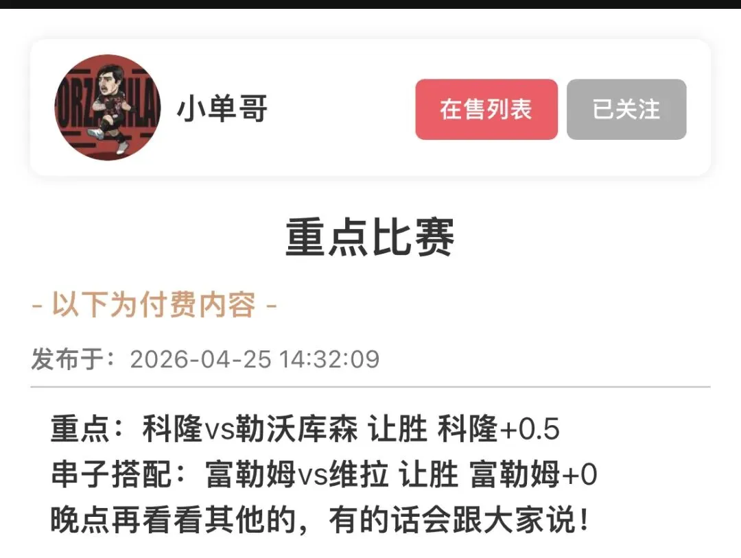 2.98套餐至少一场重点(不吃蚊子肉),一般1-2场比赛,主要为主任这边单关和一些临场比赛!