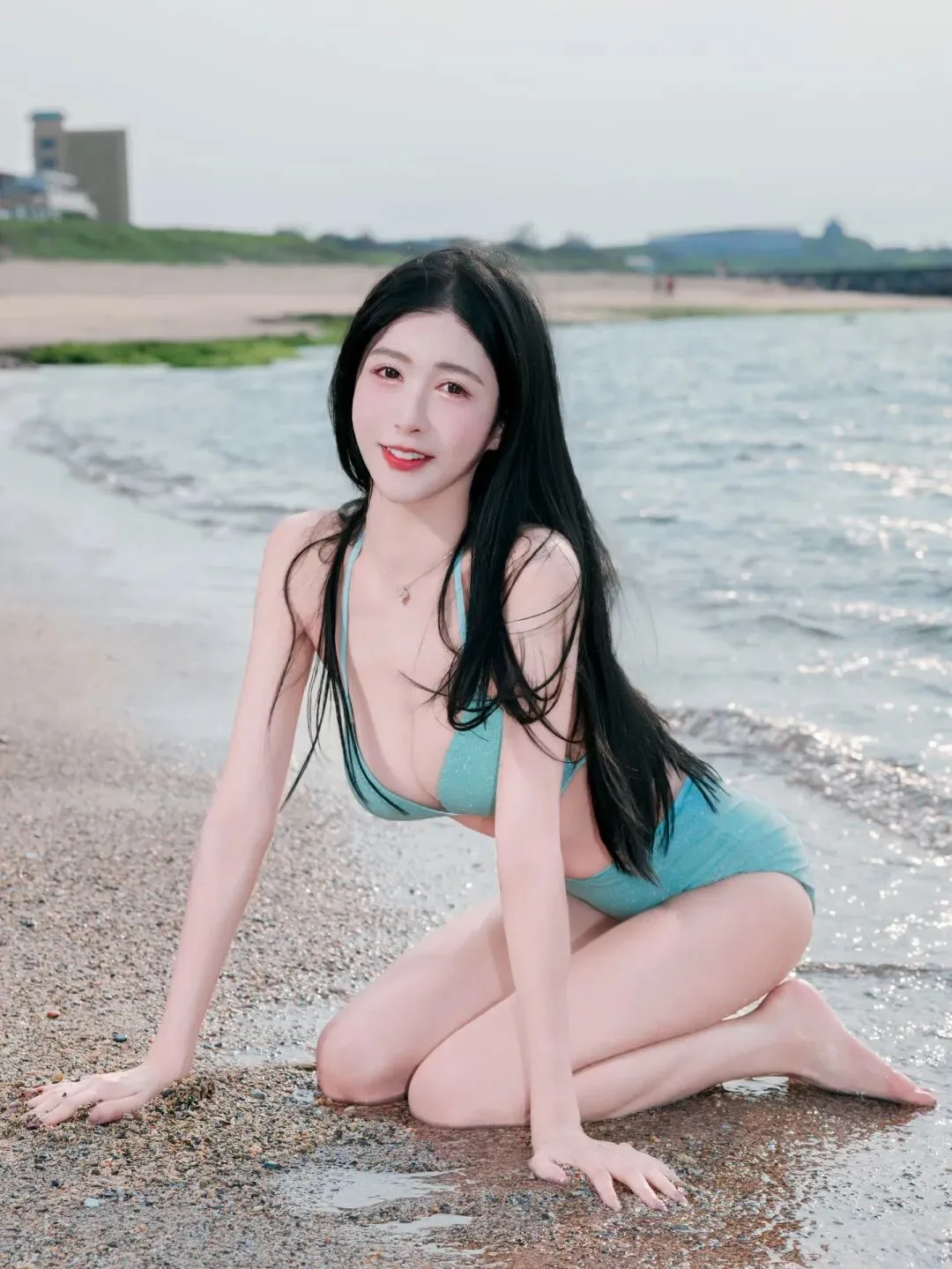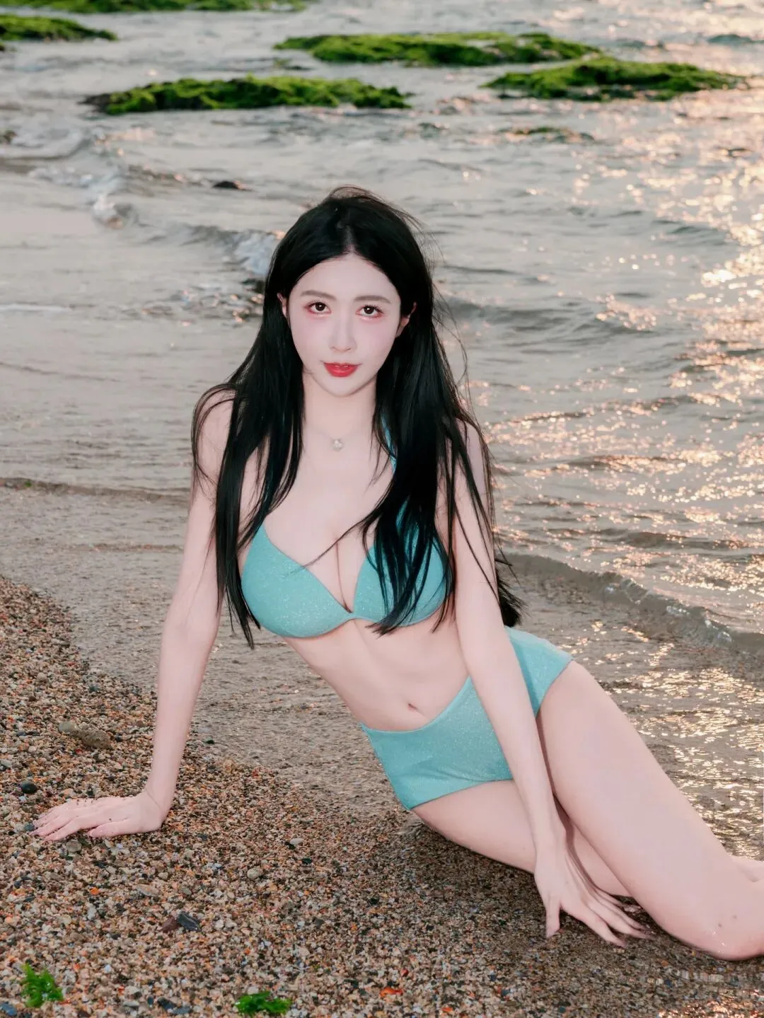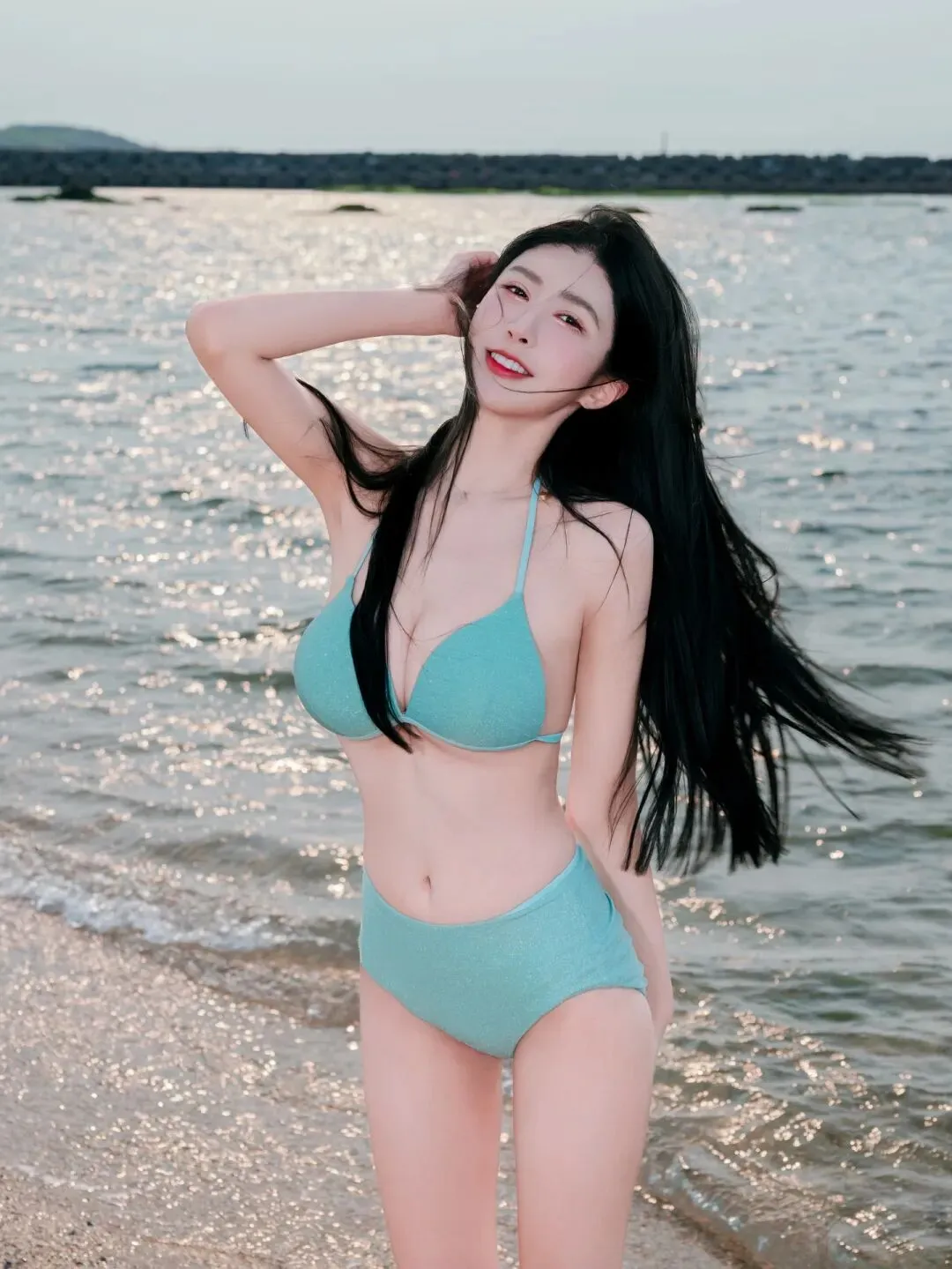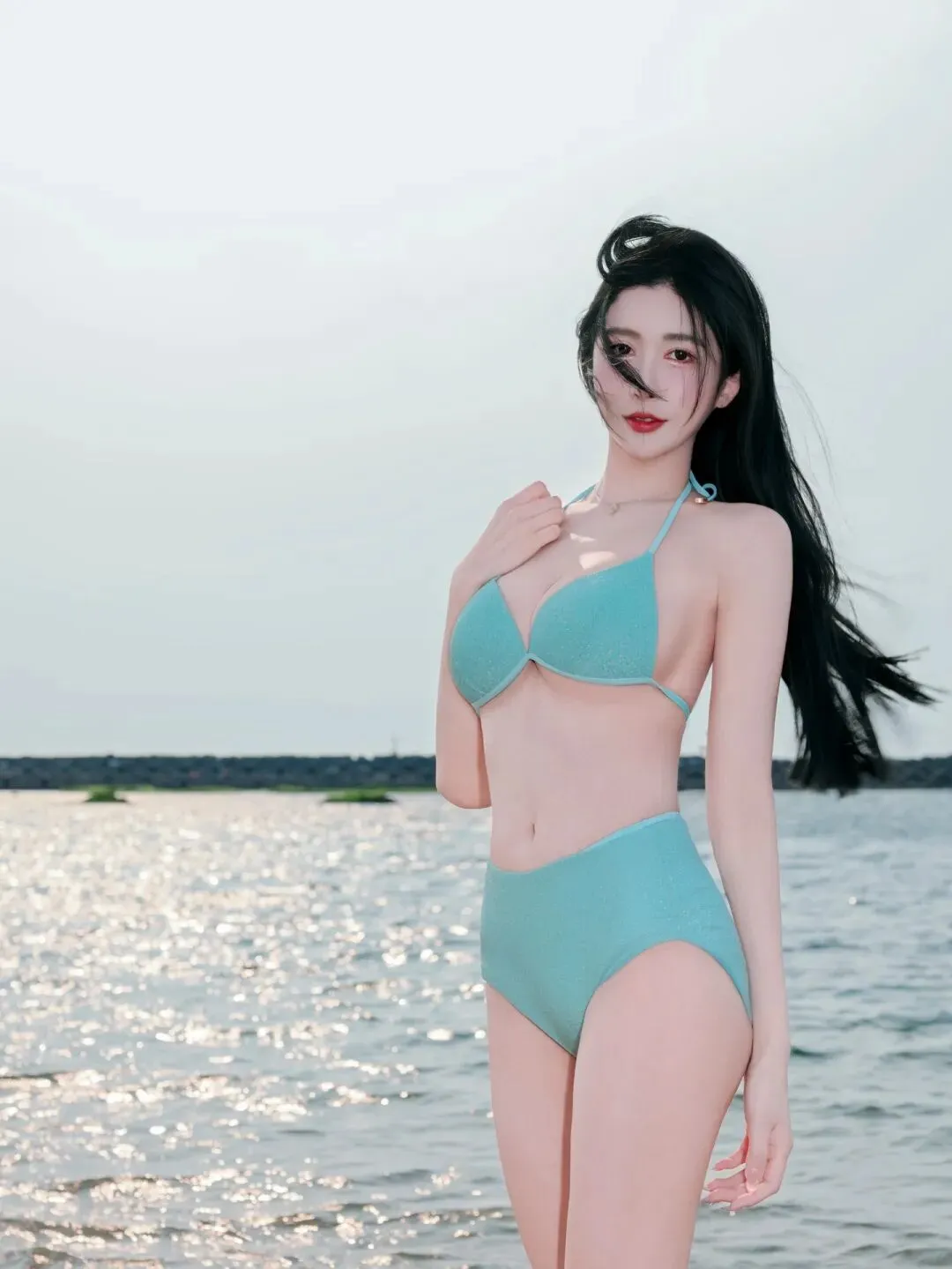 当前位置:首页>美女资讯>海边夕阳下的浅蓝比基尼女神,长发飘逸,身材火辣